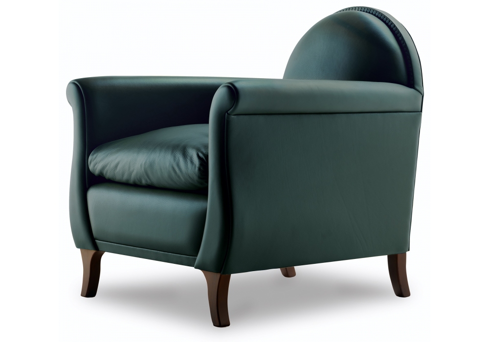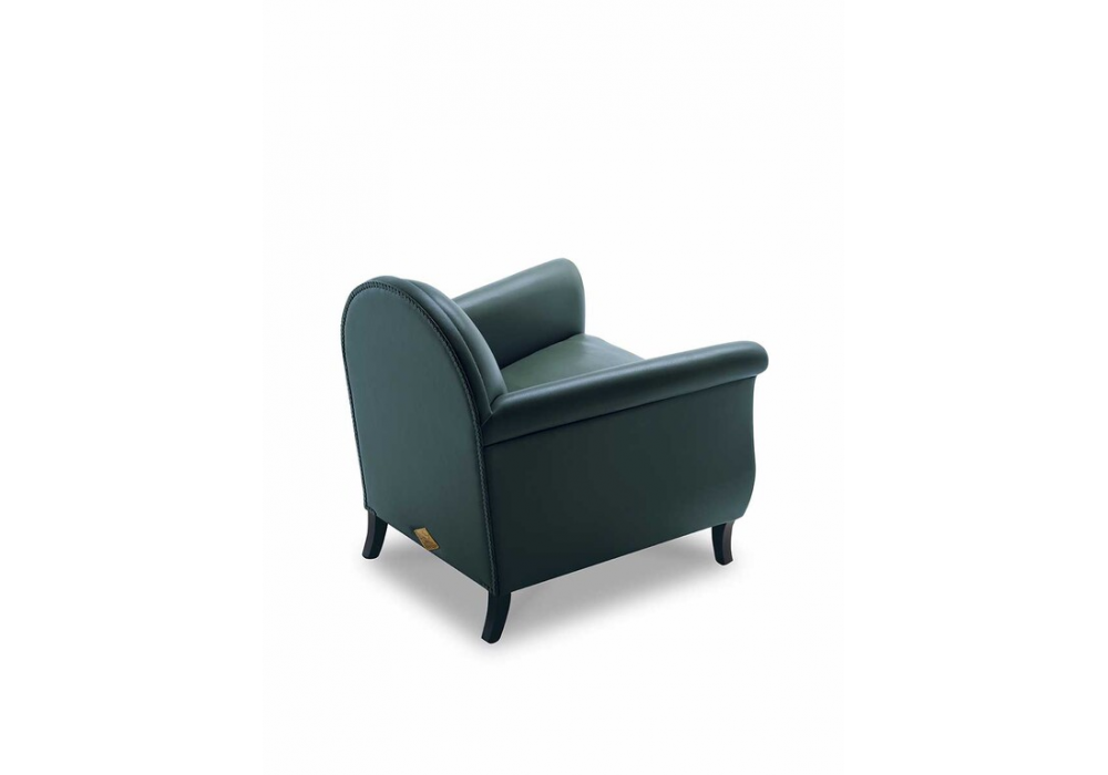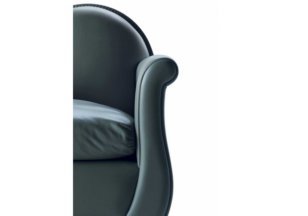 Lyra, conçu par Poltrona Frau, est un fauteuil dont la structure est en bois de hêtre traité et dont le coussin d'assise est rempli de duvet d'oie. Les pieds sont disponibles dans les finitions suivantes : hêtre teinté noyer foncé et bois laqué noir. Revêtement en cuir ou tissu Pelle Frau®. L'extérieur du dossier et le bord intérieur supérieur du dossier sont finis avec une rangée de clous recouverts de cuir. Plaque d'or 24 kt galvanisée.