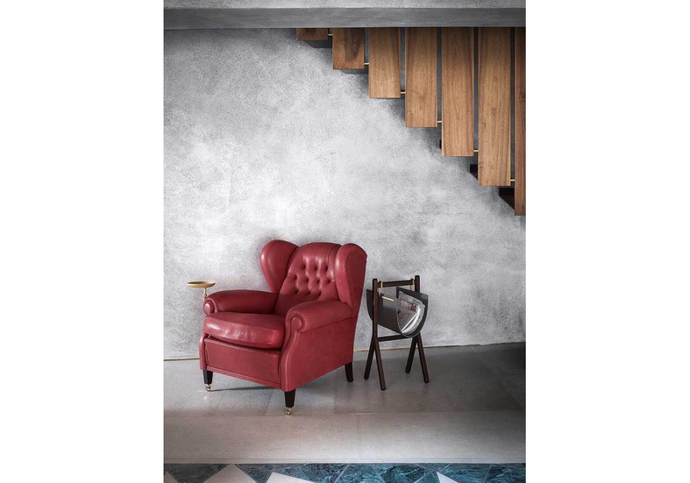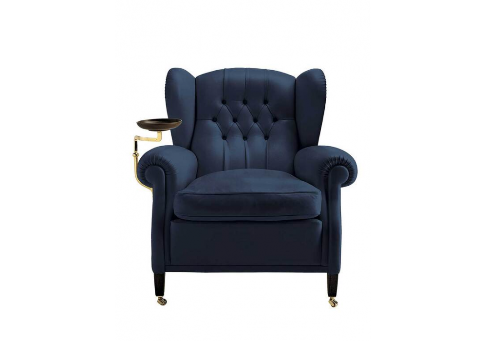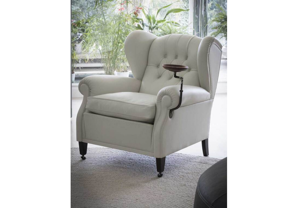 1919, conçu par Poltrona Frau, est un fauteuil dont la structure porteuse est en bois de hêtre séché et le coussin d'assise en duvet d'oie. Les pieds arrière sont en hêtre teinté noyer foncé et les pieds avant sont dotés de roues en laiton dans une finition dorée ou gris canon de fusil. Ce fauteuil est disponible dans les versions suivantes : sans plateau ou avec cendrier / porte-verre (à droite ou à gauche). Le dossier présente un design capitonné fait à la main. Le dossier extérieur du fauteuil est terminé par une rangée de clous recouverts de cuir. Rembourrage en cuir Pelle Frau®.
