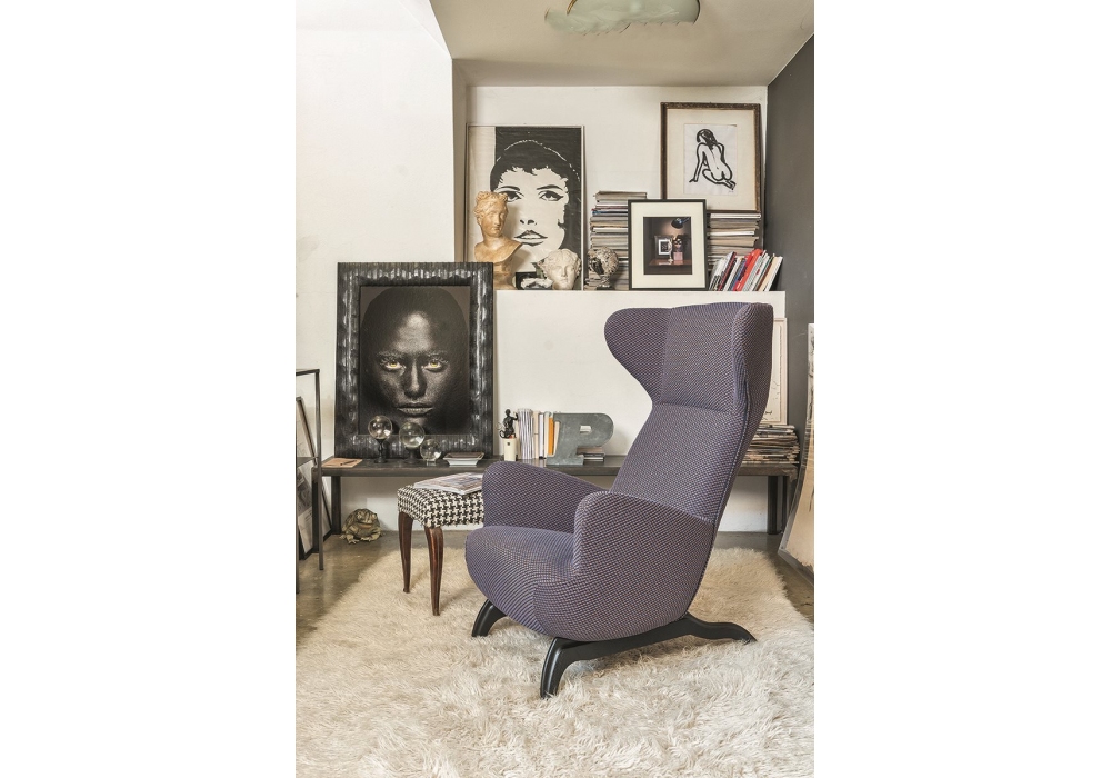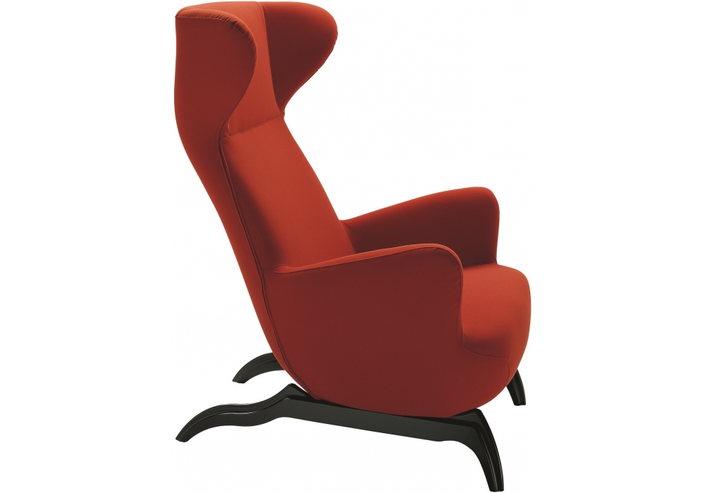 882 Ardea conçu par Carlo Mollino pour Zanotta est un fauteuil réalisé avec base en chêne naturel massif, teinté noir ou en noyer canaletto massif. Structure en acier avec ressorts sur bandes élastiques. Revêtement extérieur amovible en tissu ou en cuir.