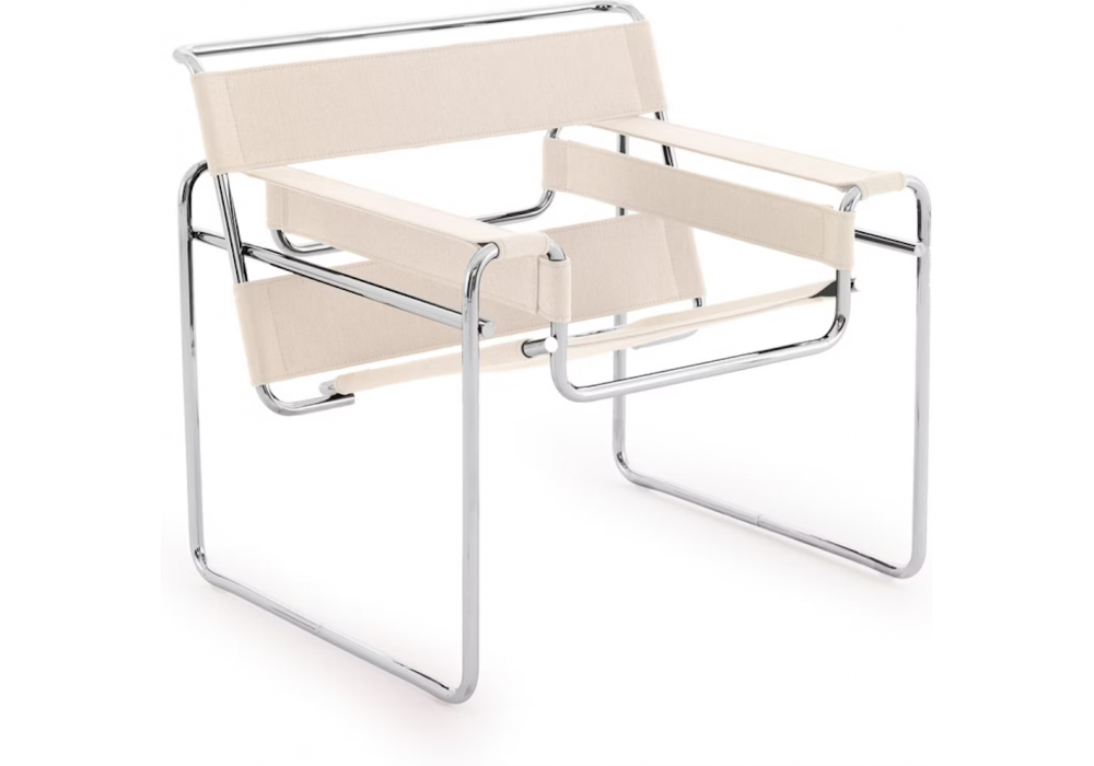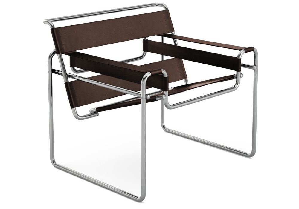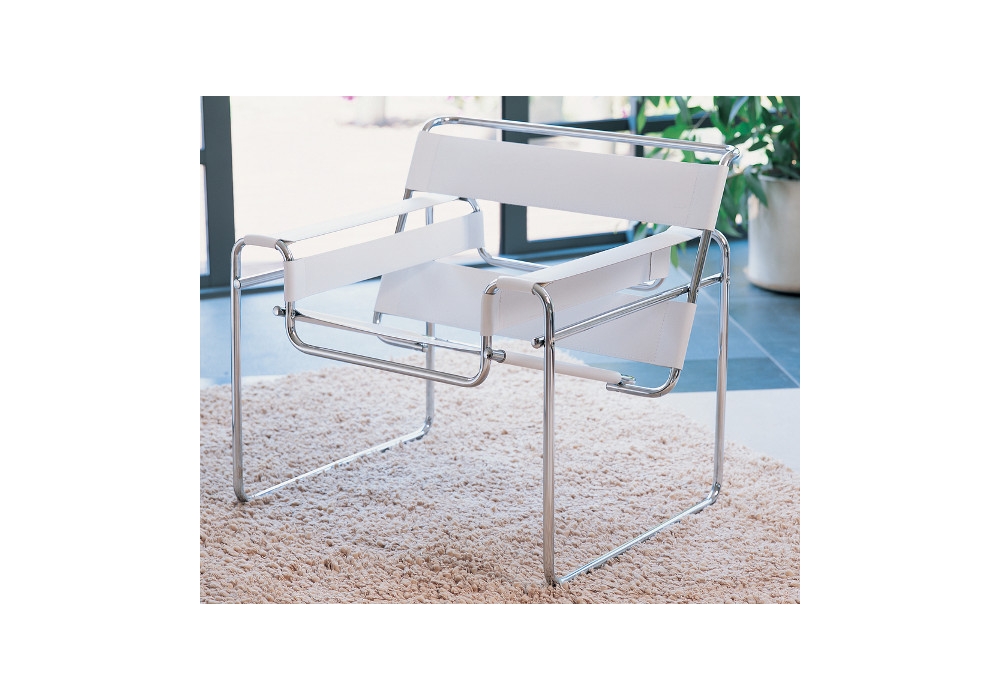 Wassily conçu par Marcel Breuer pour Knoll est une Fauteuil avec structure en tube d'acier chromé ou peint époxy mat. Revêtement en cuir ou sangles en toile dans différentes finitions.