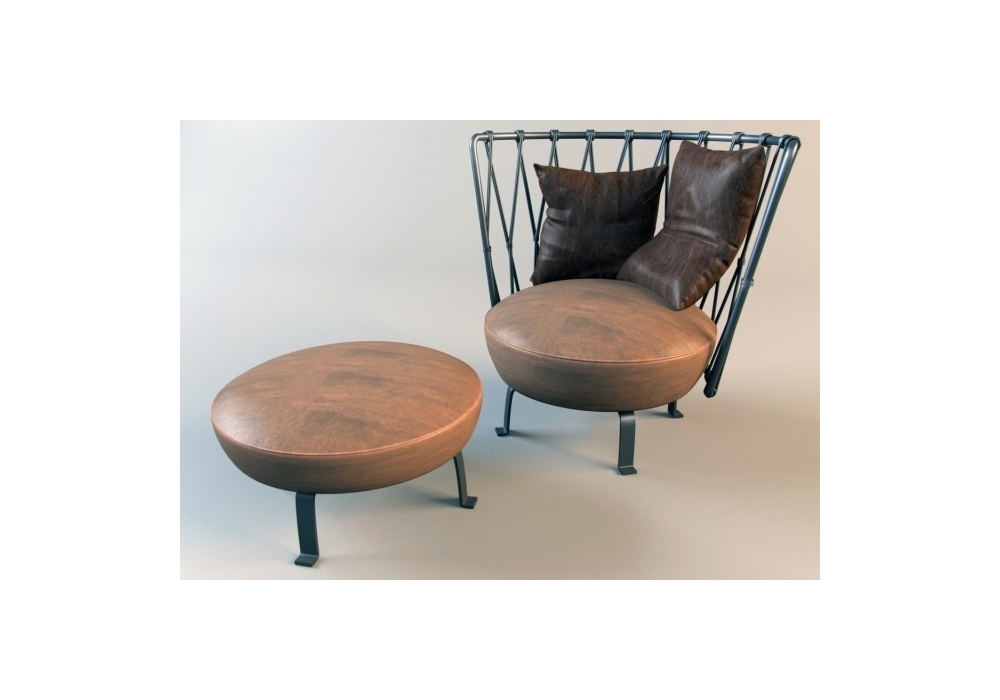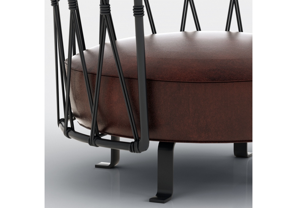 Pedro conçu par Roberto Lazzeroni pour Baxter est un beau fauteuil avec structure en métal vernis noir mat. Siège en mousse de polyuréthane avec fibre acrylique 100% polyester. Dossier avec entrelacement en cuir rond, couleur brun foncé. Base pivotante. Coussin 50 x 70 cm inclus.