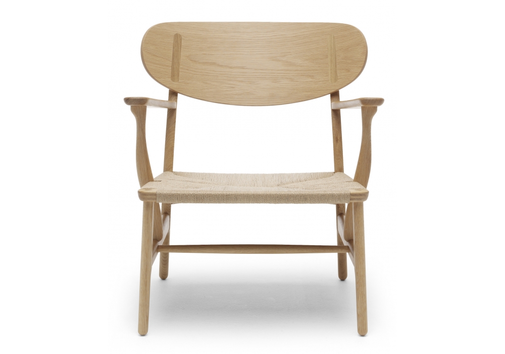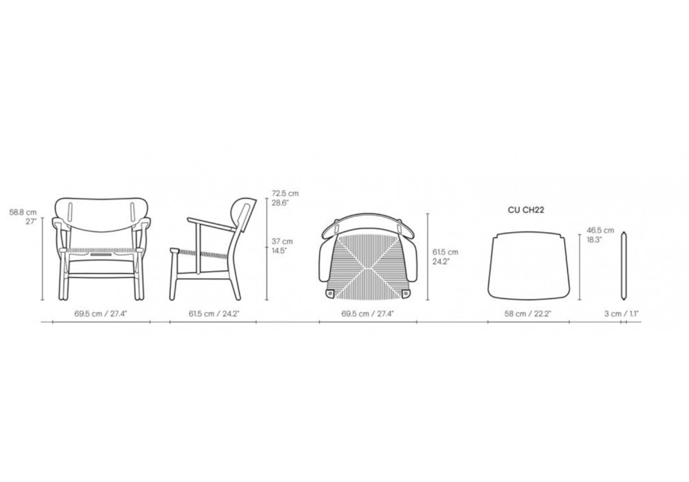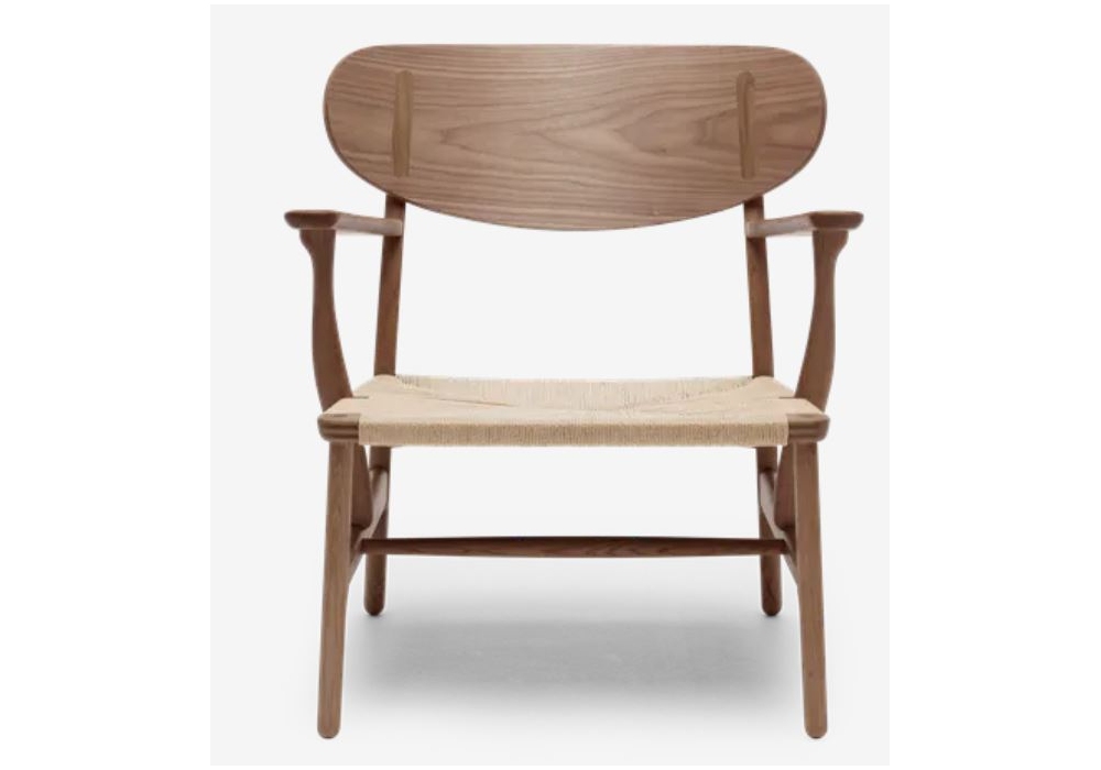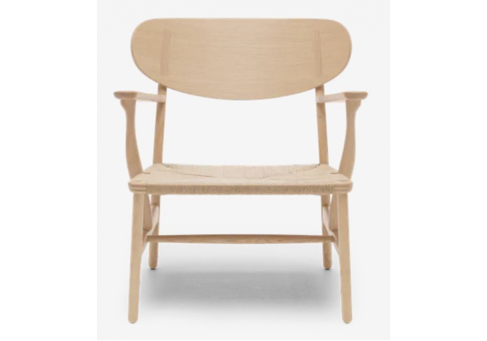 CH22 conçu par Hans J. Wegner pour Carl Hansen & Søn est un fauteuil avec structure en bois massif en noyer ou chêne en différentes finitions. Assise en corde de papier noir ou naturel. Chêne/noyer est une version combinée avec structure/incrustations en chêne et accoudoirs/dossier en noyer. Chêne/teck est une version combinée avec structure en chêne et accoudoirs/dossier/incrustations en teck.