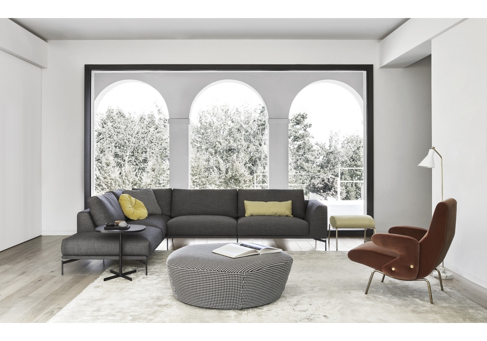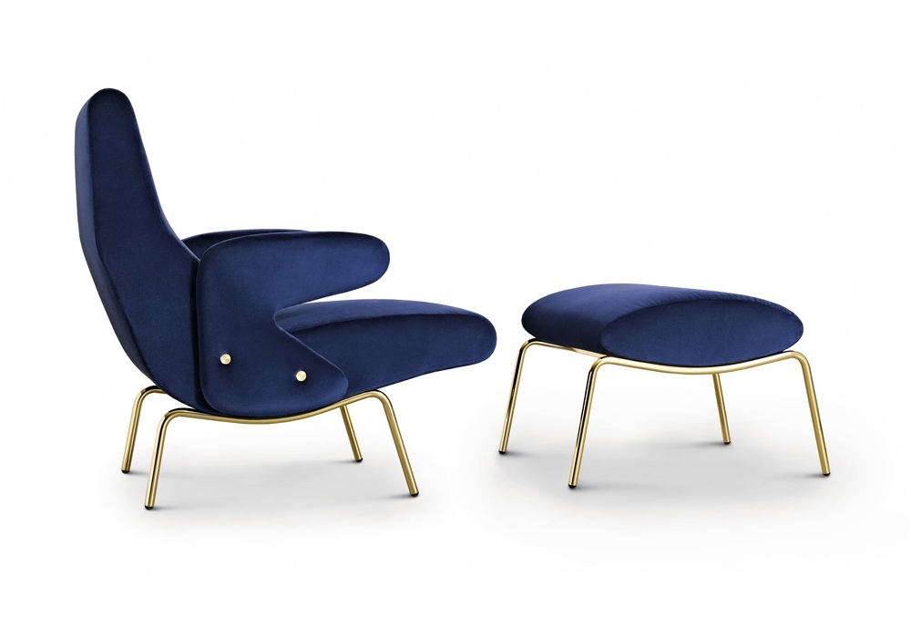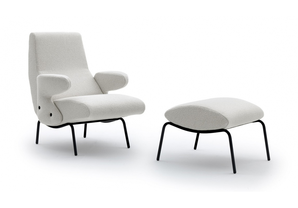 Delfino conçu par Erberto Carboni pour Arflex est un fauteuil avec structure en métal laqué noir ou doré. Revêtement en tissu ou en cuir.