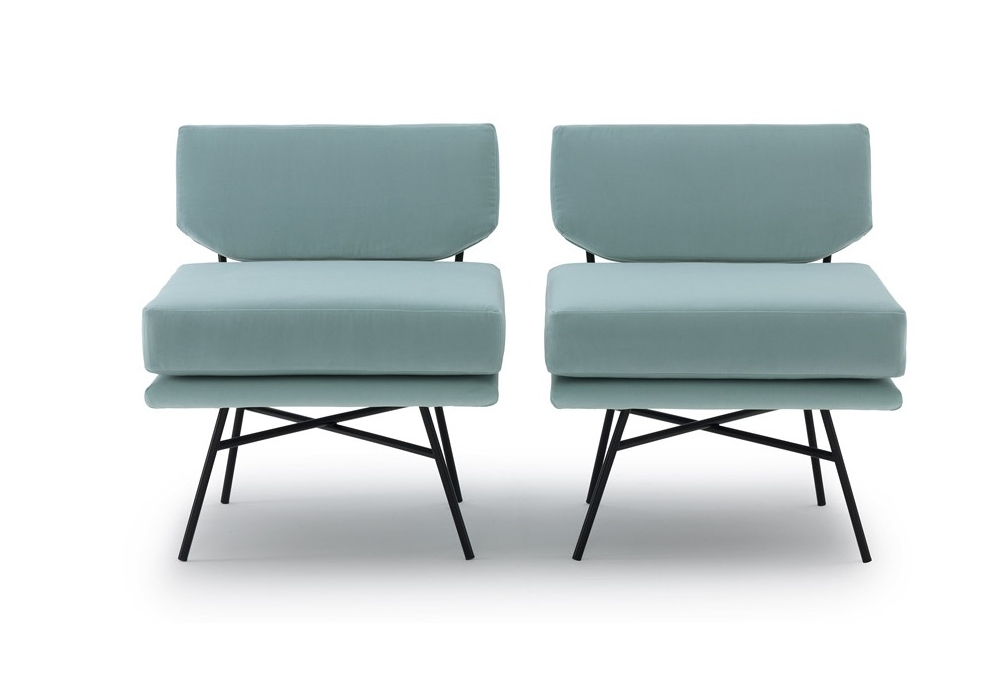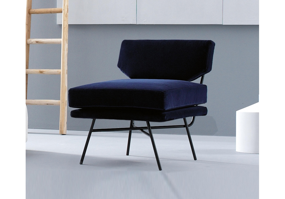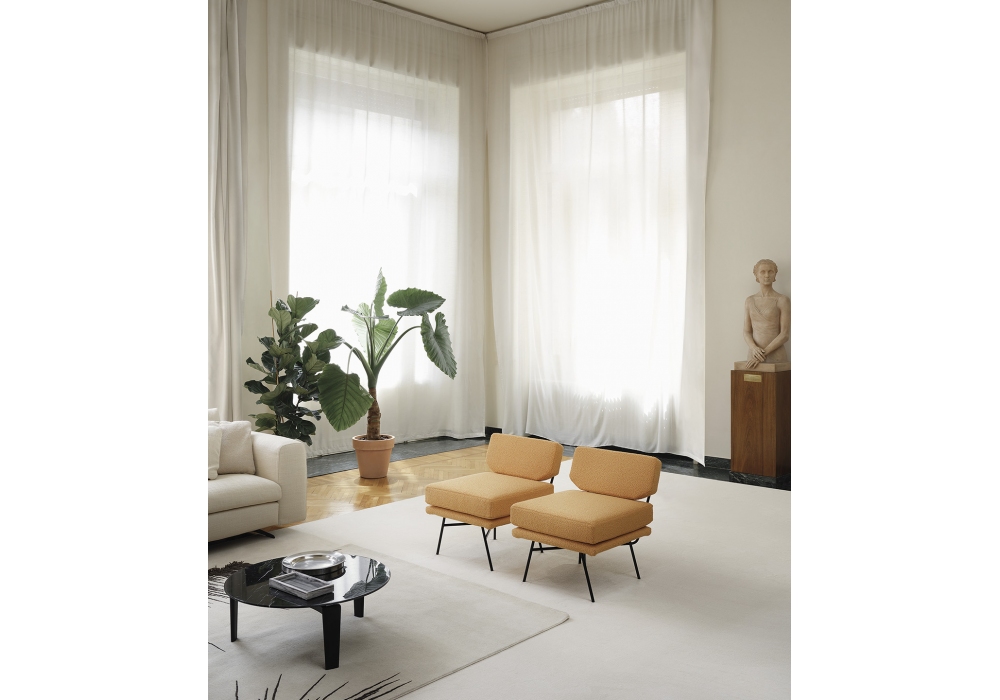 Elettra conçu par B.B.P.R pour Arflex est un fauteuil avec structure en métal laqué noir. Coussin d'assise en polyuréthane profilé à densité différenciée / fibre polyester. Revêtement en tissu ou fourrure à poils courts.