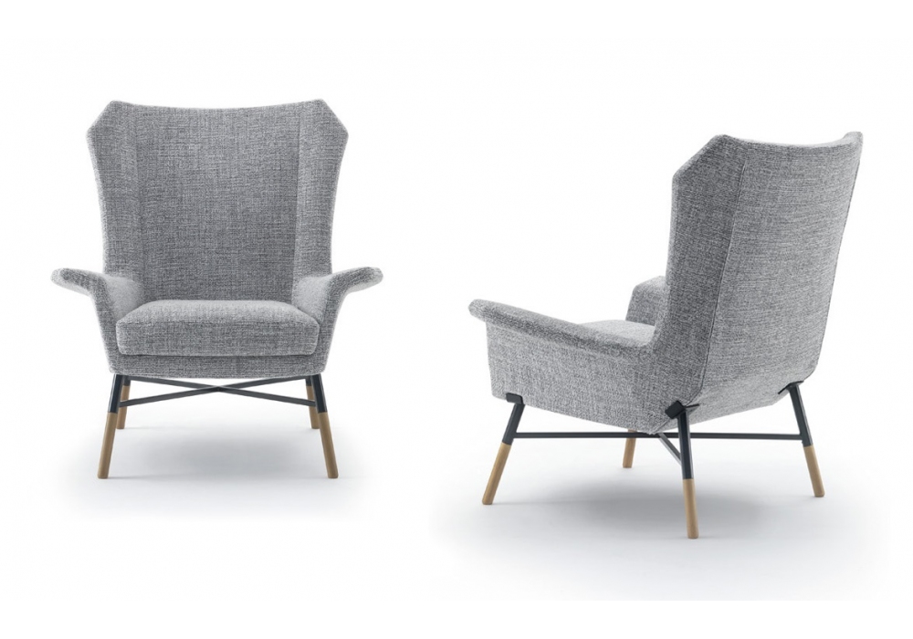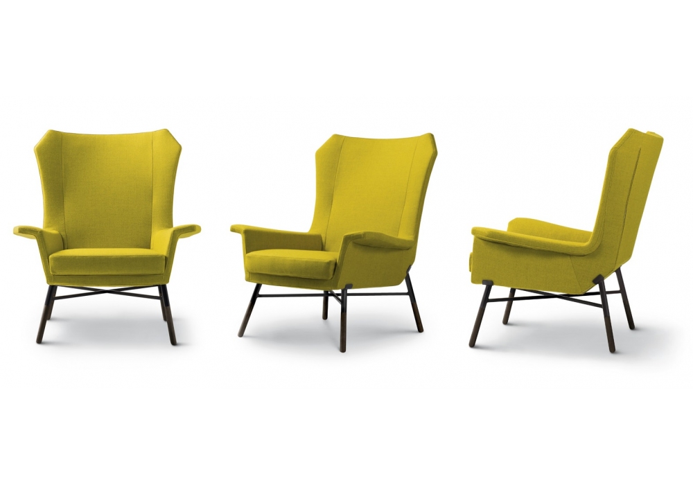 Giulietta conçu par B.B.P.R pour Arflex est un fauteuil avec jambes en métal laqué noir et bois teinté wengé, chêne ou chocolat. Coussin d'assise en polyuréthane moulé à densité différenciée /fibre de polyester. Revêtement en tissu ou en cuir.