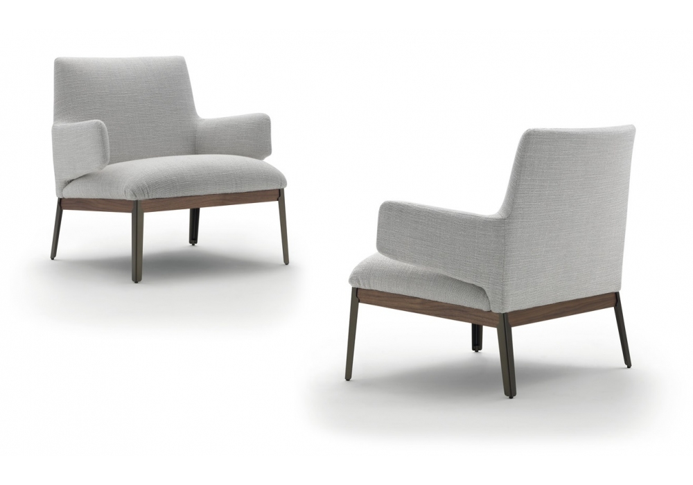 Hug conçu par Claesson Koivisto Rune pour Arflex, est un fauteuil avec base en métal laqué et pieds réglables en PVC noir. Profilés en noyer Canaletto, wengé, chêne ou bois teinté chocolat. Revêtement en tissu ou cuir.