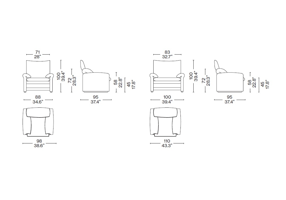 675 Maralunga conçu par Vico Magistretti pour Cassina est un fauteuil réalisé avec une base en plastique, un rembourrage en mousse de polyuréthane sans CFC et en ouate de polyester et un revêtement en tissu ou en cuir.