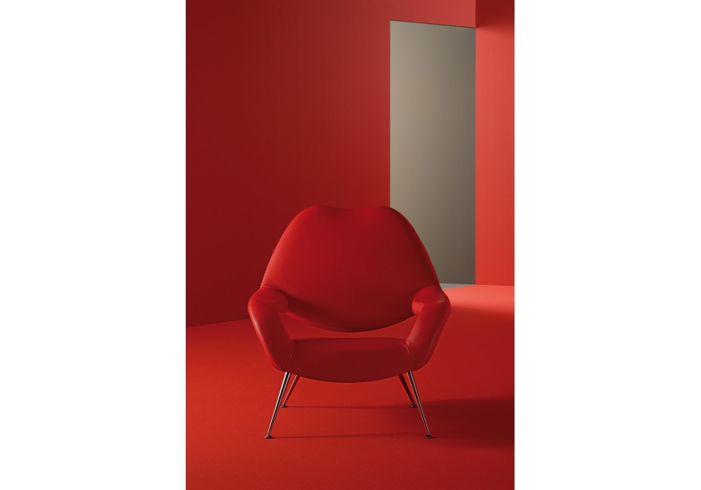 DU 55, conçu par Gastone Rinaldi pour Poltrona Frau, est un fauteuil avec structure portante en acier et rembourrage en mousse de polyuréthane moulée. Les pieds coniques en acier sont disponibles en trois finitions : plaqué frêne teinté teck avec finition antique et capuchons en laiton ; revêtement texturé noir, avec effet plissé, avec capuchons noirs ; poli chromé avec capuchons chromés. Revêtement en cuir ou tissu Pelle Frau®.