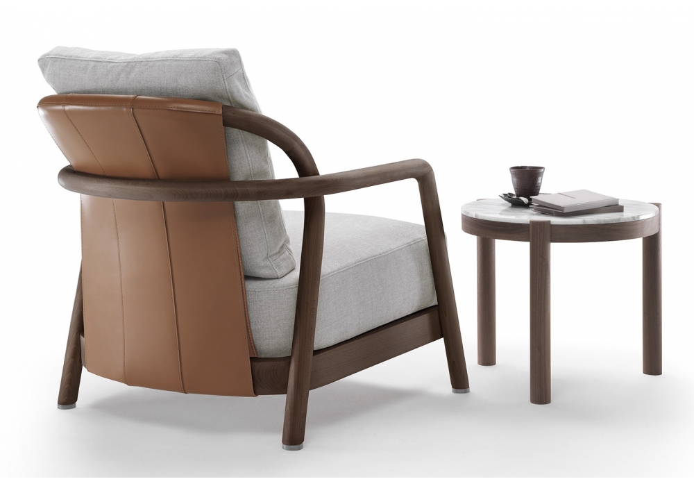Alison conçu par Carlo Colombo pour Flexform est un fauteuil avec structure en bois de noyer canaletto ou en frêne. Revêtement assise et coussin dossier en tissu ou cuir. Dossier avec bande en cuir. Pieds en métal.