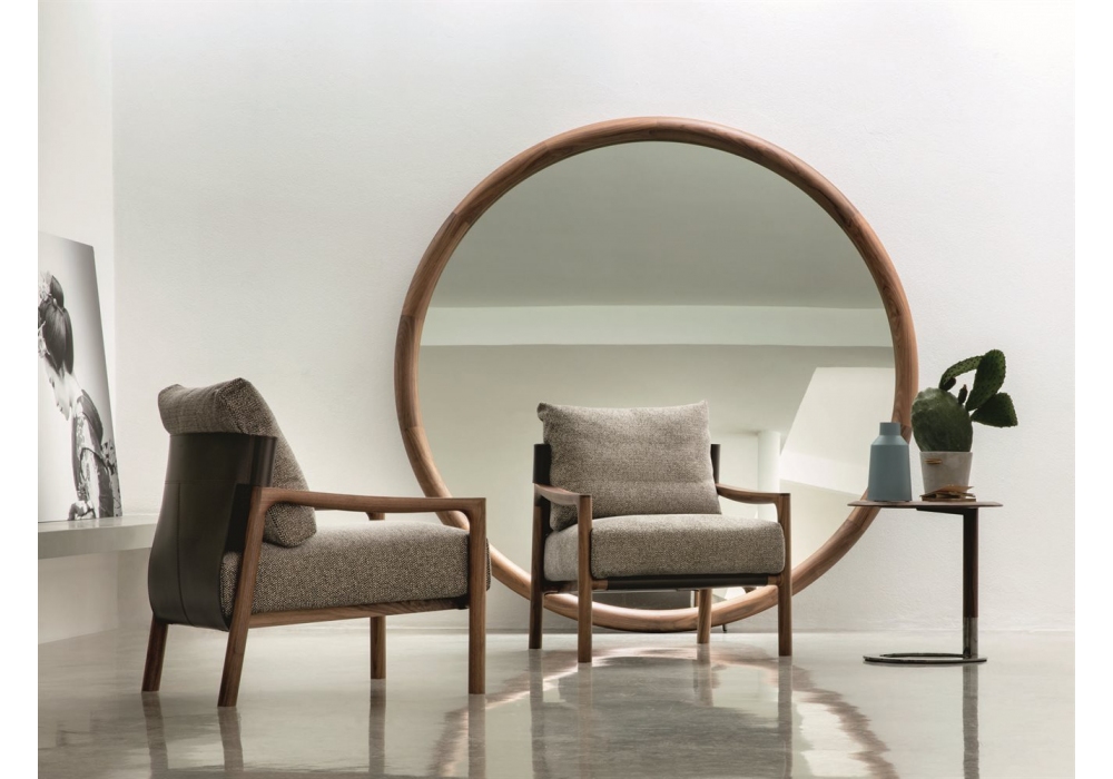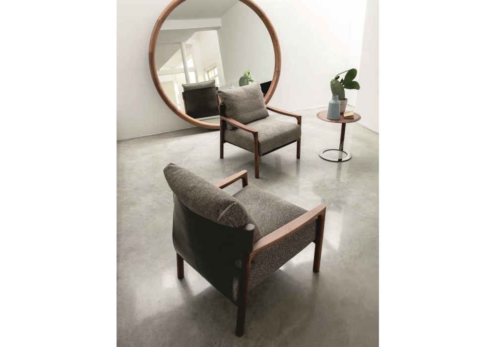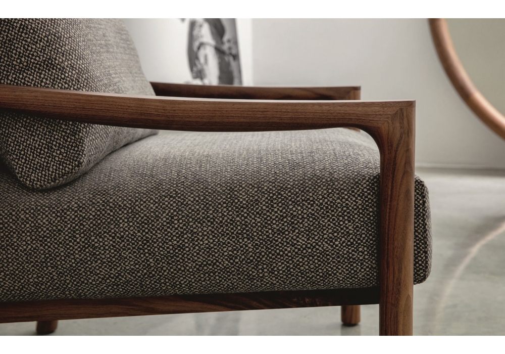 Vera conçu par Gabriele & Oscar Buratti pour Porada est un fauteuil avec structure en noyer canaletto, dossier en cuoietto et tapissé en tissu.