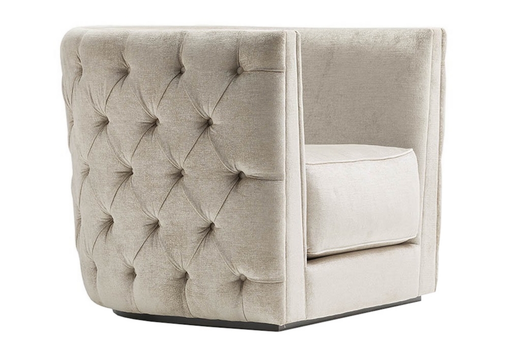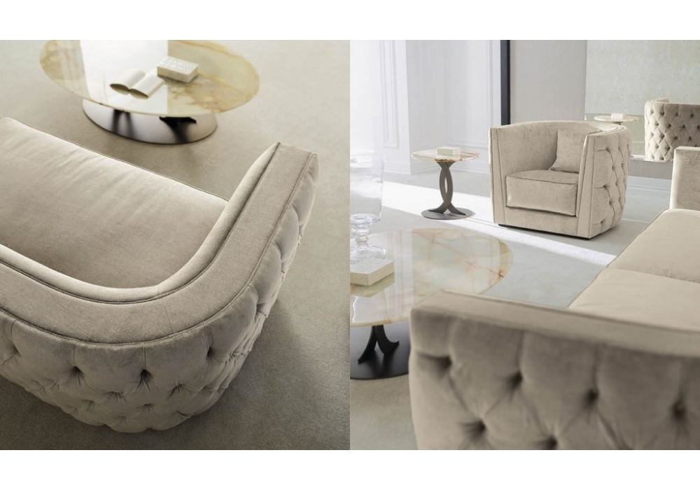 Leandro conçu par Castello Lagravinese Studio pour Opera Contemporary est un fauteuil avec un raffiné travail capitonnè présenté sur le arrière du dossier et revêtement disponible en tissu ou cuir. Base ronde en bois.