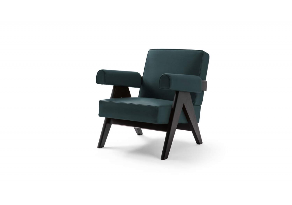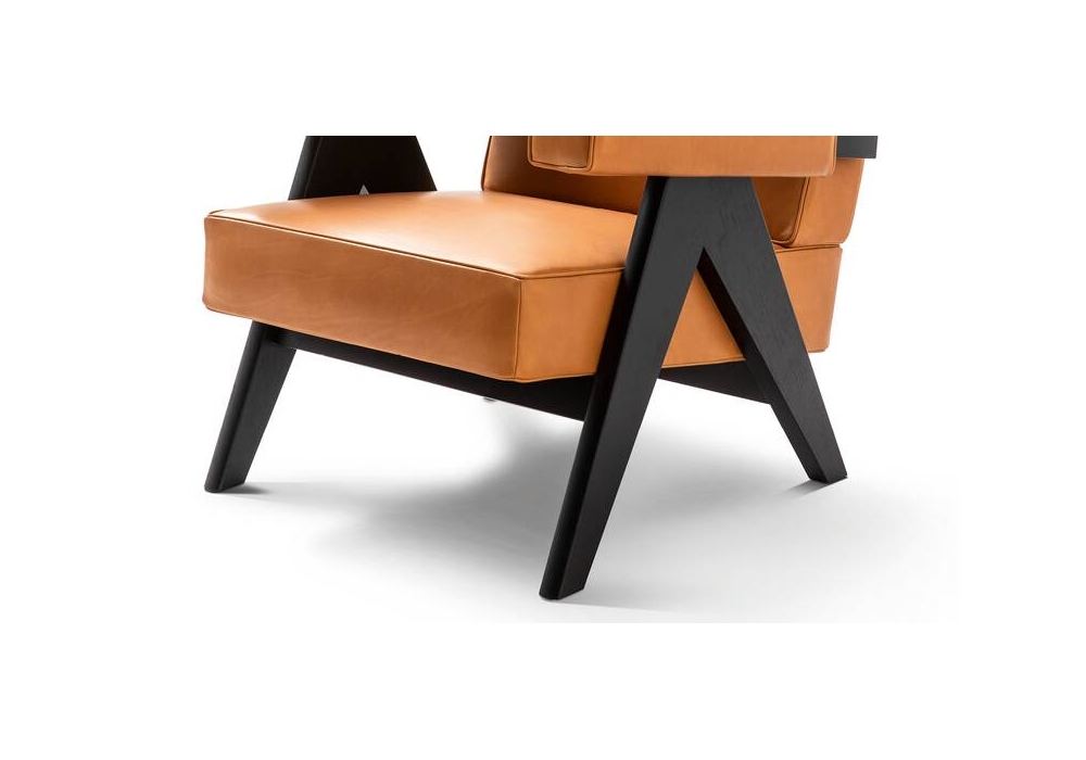 053 Capitol Complex Armchair conçu par Pierre Jeanneret pour Cassina est un fauteuil avec dossier et siège rembourrés. Structure en bois massif, disponible dans les finitions suivantes: chêne naturel, teinté noir, teinté noyer foncé ou teck.