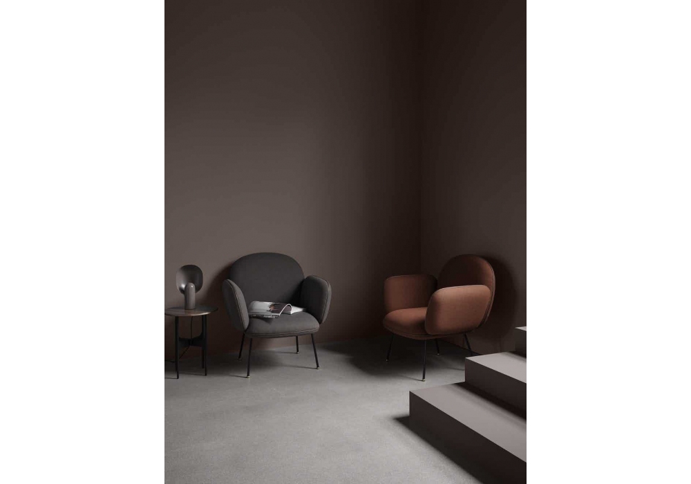 Ollie conçu par Susanne Grønlund pour wendelbo est un fauteuil avec pieds en acier laqué noir et détails en laiton plaqué. Rembourrage en mousse haute résilience et revêtement en cuir ou en tissu.