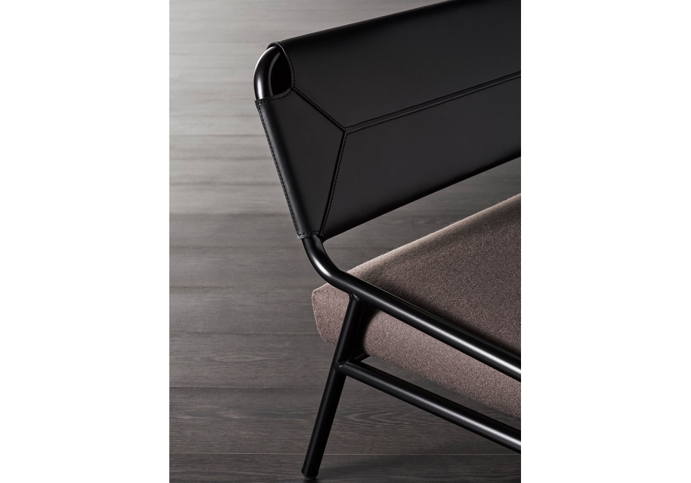 Zoe Kuoio conçu par Andrea Parisio pour Meridiani est un fauteuil avec structure en aluminium verni et coussin d'assise en polyuréthane et fibre de polyester. Dossier avec revêtement en cuir sellier.