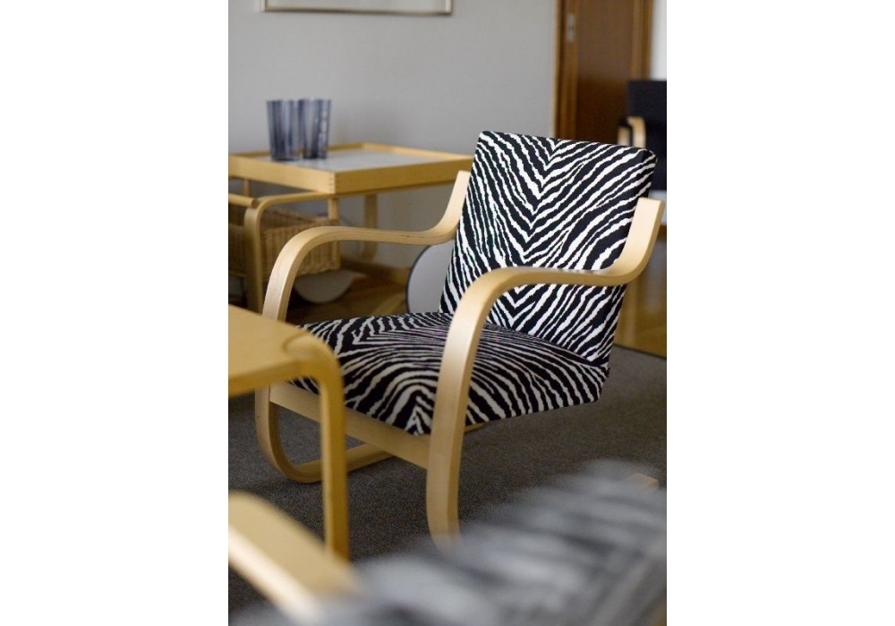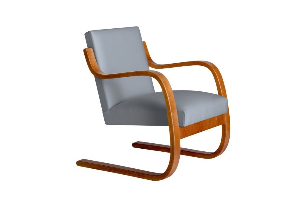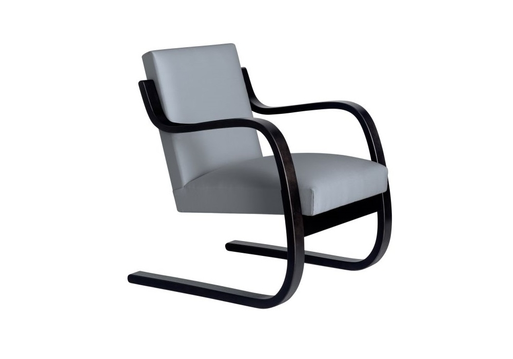Armchair 402 conçu par Alvar Aalto pour Artek est un fauteuil réalisé avec revêtement en tissu ou cuir et structure teintée ou laquée. Disponible en différentes finitions.