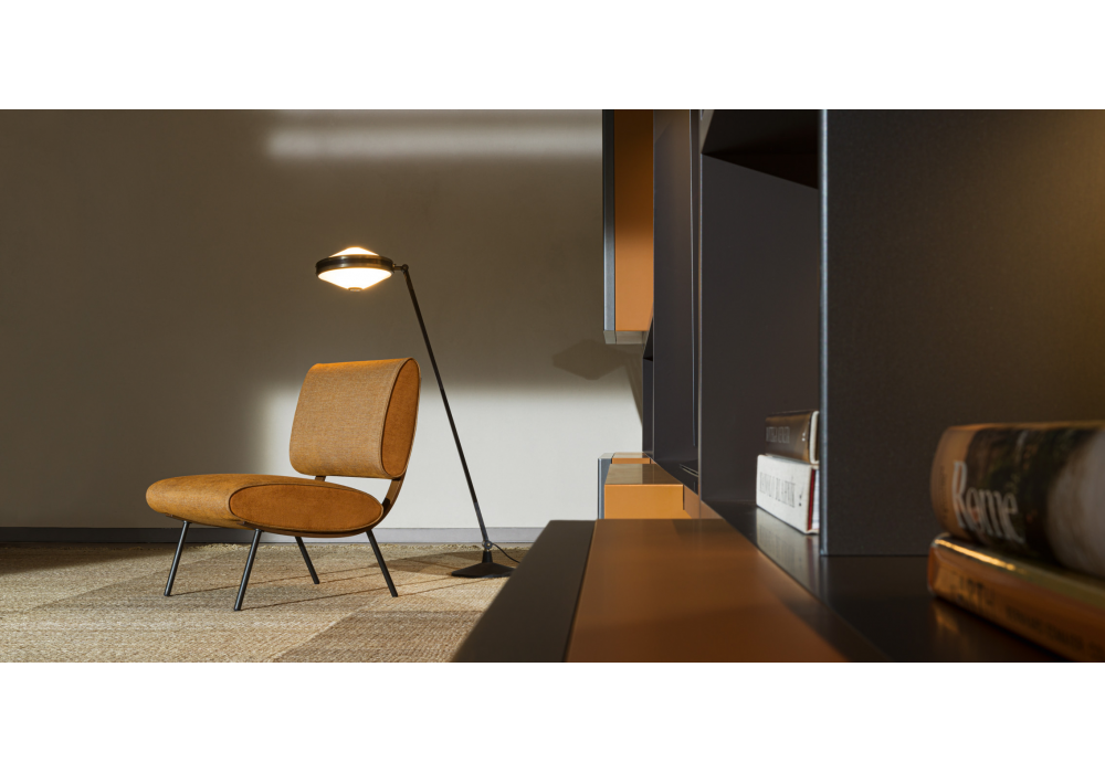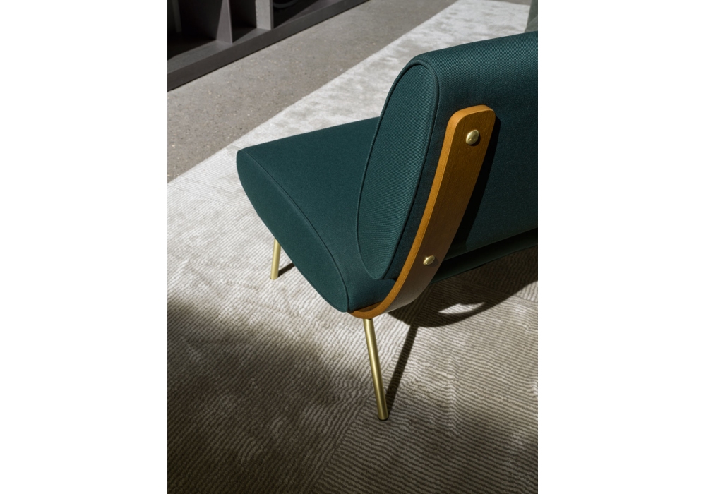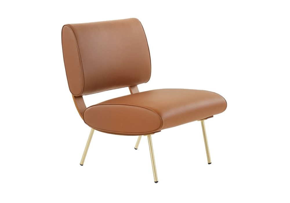 Round D.154.5 conçu par Gio Ponti pour Molteni&C est un fauteuil iconique aux formes très modernes voire «spatiales», jamais pensé auparavant. Le nom vient de la forme arrondie du siège et des dossiers. Il utilise des matériaux et des technologies de pointe pour sa construction, tels que l'utilisation de Vipla (matière plastique imitant le cuir) pour le rembourrage, du contreplaqué courbé pour fixer le dossier et l'assise ensemble, et des pieds en métal avec une pointe antidérapante facile. assemblable. Il est également défini, dans l'étude Ponti / Fornaroli / Rosselli, "Eight Pieces". En fait, huit pièces le composent: dossier, assise, deux éléments courbes en contreplaqué et quatre pieds, qui se vissent à l'assise maintiennent tout ensemble.