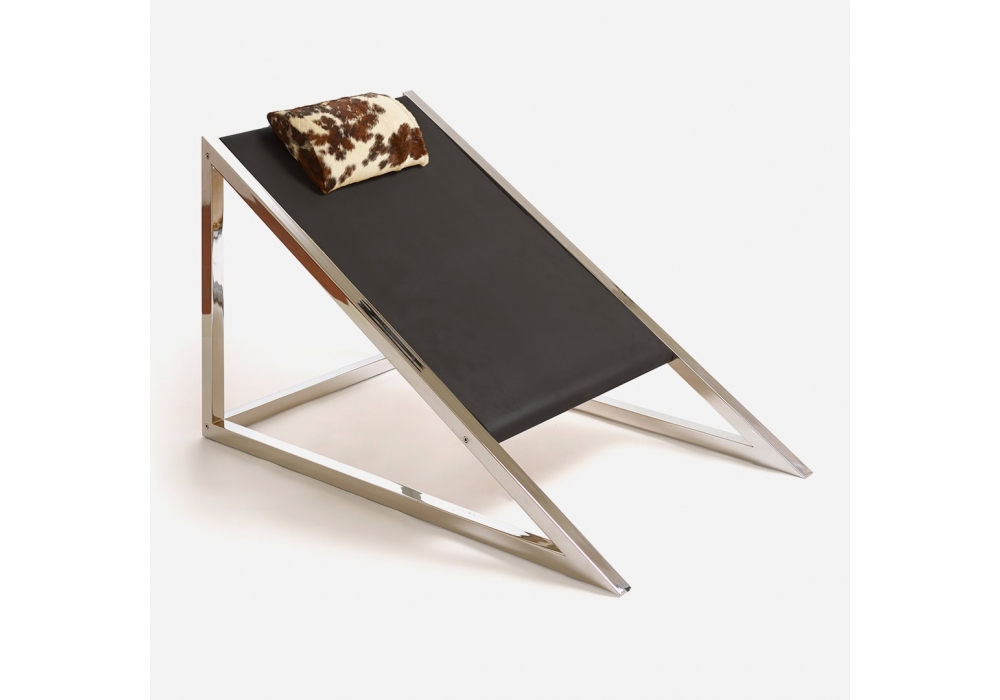 Mies conçu par Archizoom Associati pour Poltronova est un fauteuil composé d'une assise en plaque de latex noir, d'une structure en métal chromé, d'un coussin d'appui-tête et d'un repose-pieds lumineux recouverts de peau de poney blanche et marron. Disponible avec ou sans repose-pieds.