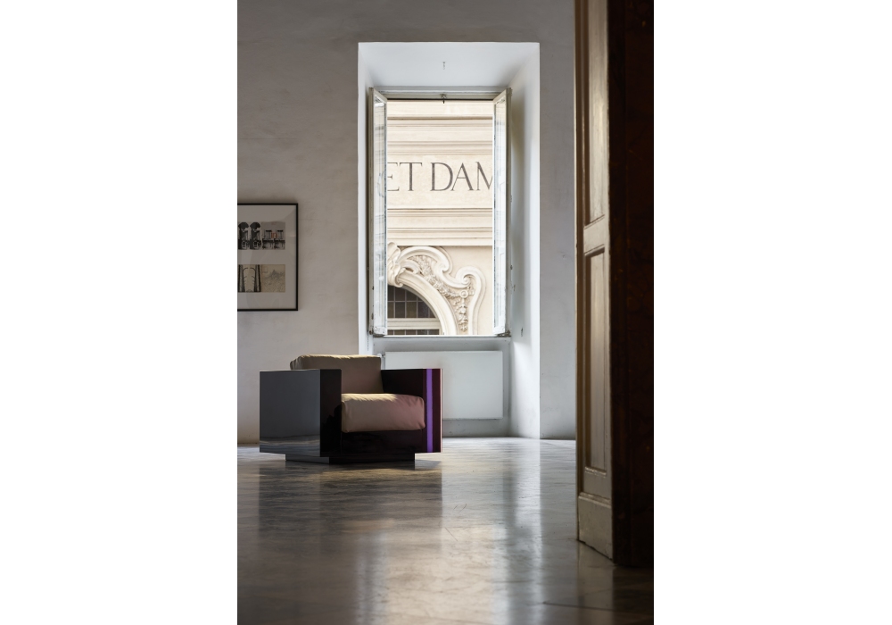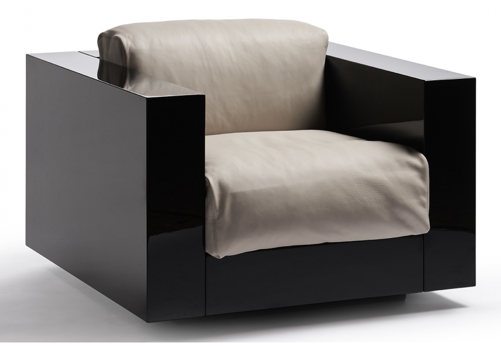 Saratoga conçu par Lella & Massimo Vignelli pour Poltronova est un fauteuil réalisé avec structure en bois laqué en polyester brillant et coussins rembourrés en cuir. Disponible en différentes finitions.