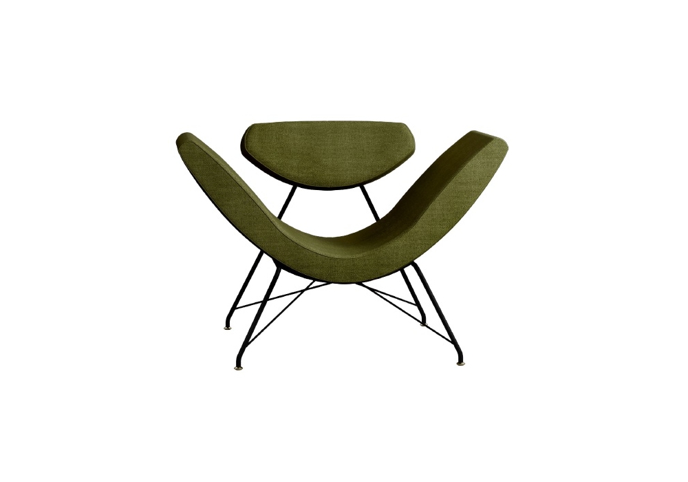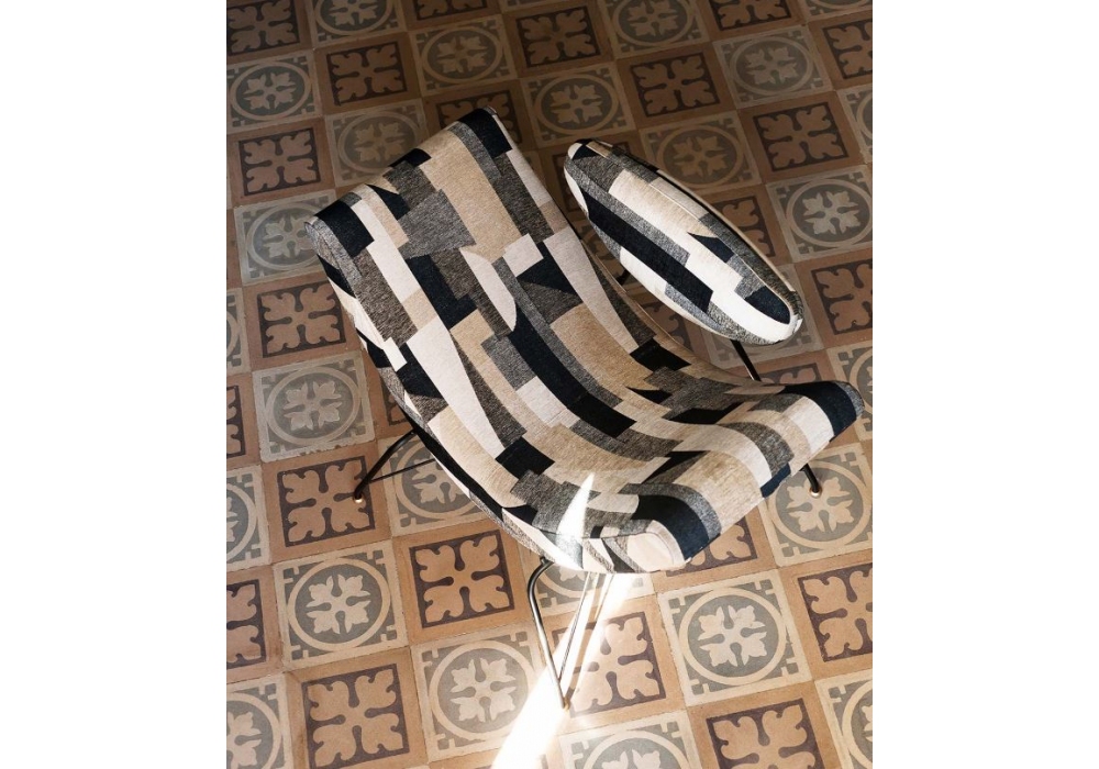 Reversivel conçu par Martin Eisler pour Tacchini est un fauteuil avec dossier en contreplaqué de peuplier, assise avec insert en fer et sangles élastiques et base en métal peint. Les pieds sont en fer chromé, tandis que le revêtement non amovible est disponible en différents tissus et couleurs.