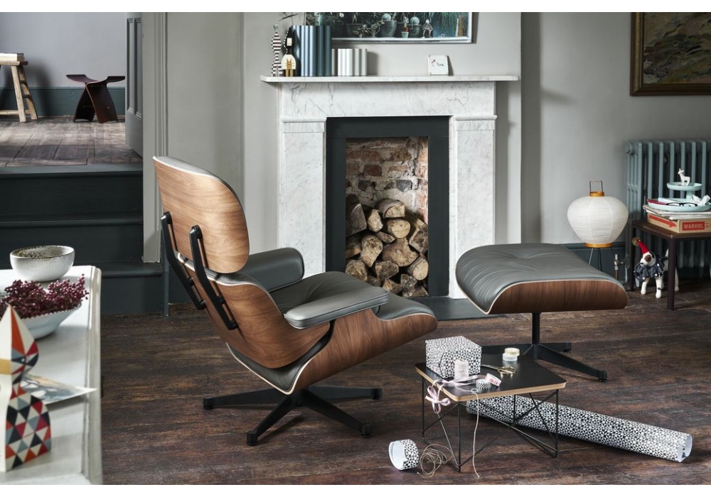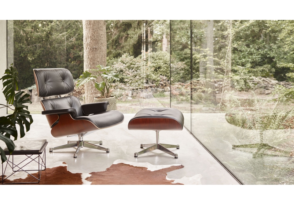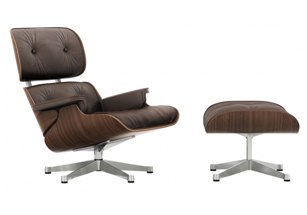 Lounge Chair & Ottoman conçu par Charles & Ray Eames pour Vitra est un fauteuil avec repose-pieds réalisé avec revêtement en cuir, base en aluminium poli ou avec côtés noirs et patins durs ou avec inserts en feutre. Coque en noyer pigmenté noir.