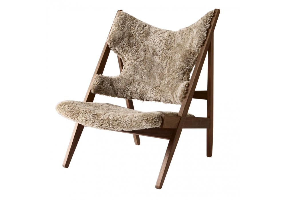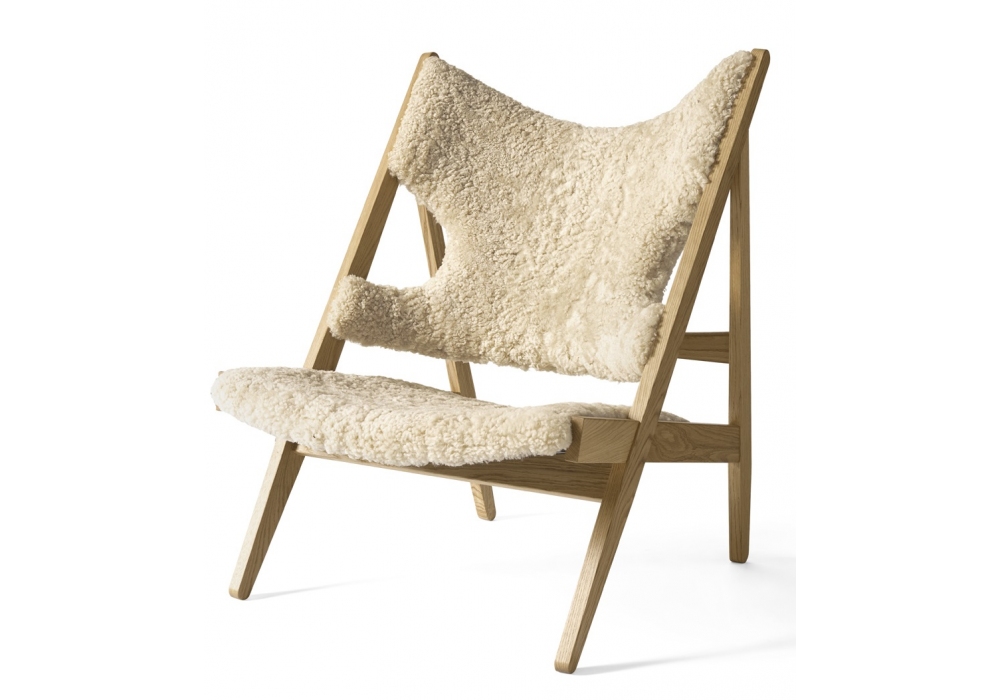 Knitting conçu par Ib Kofod-Larsen pour Audo Copenhagen est un fauteuil réalisé en chêne naturel, chêne teinté foncé ou noyer. Assise et dossier rembourrés en cuir ou en peau de mouton.