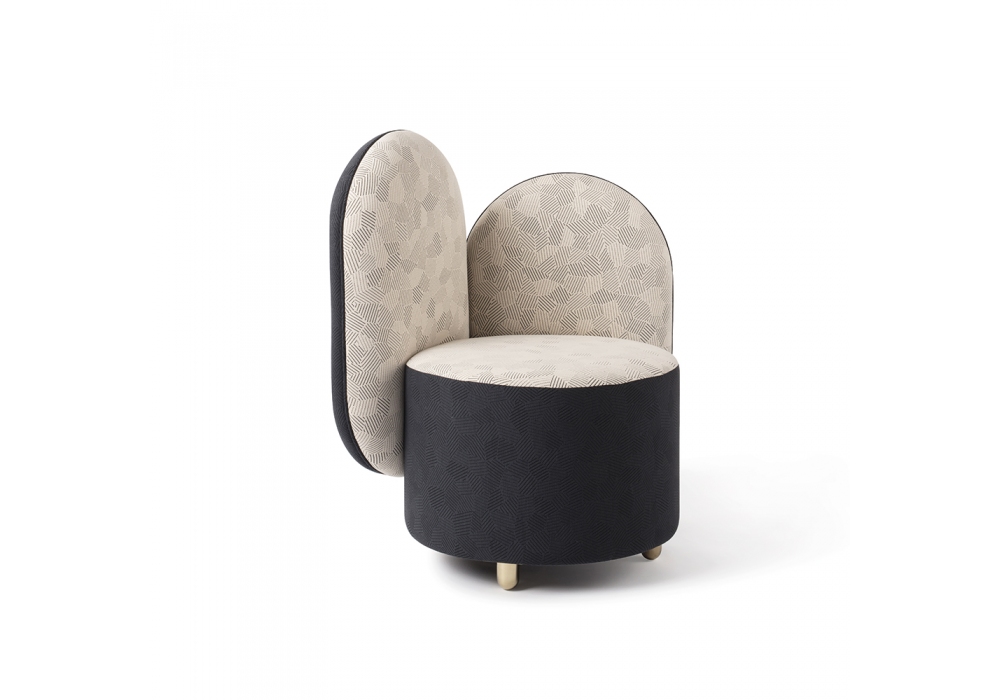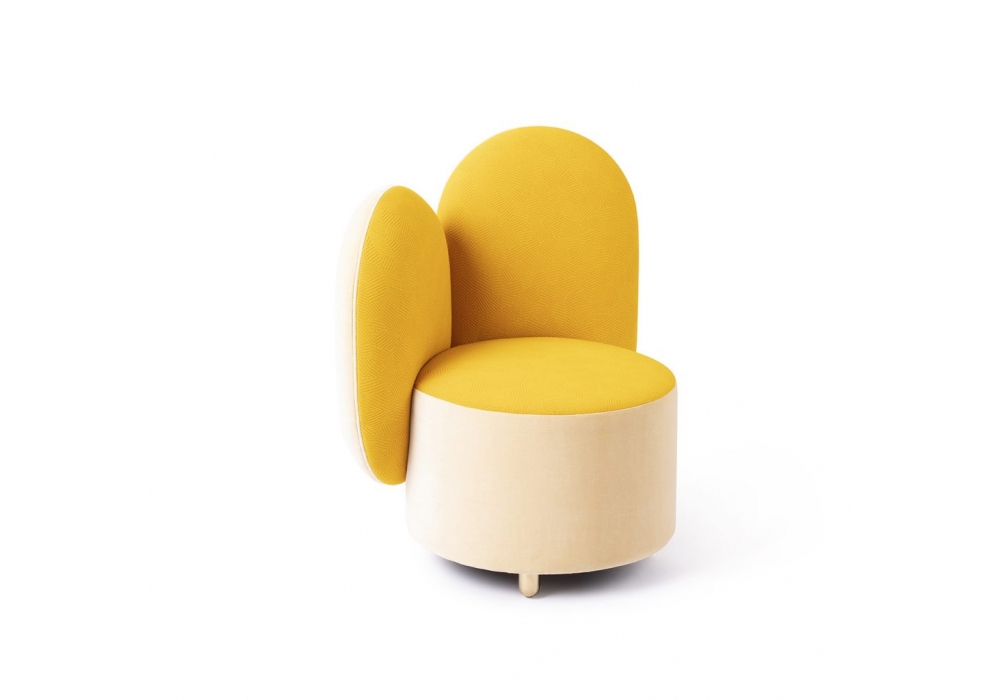 Yiban Yiban conçu par Thomas Dariel pour Maison Dada est un fauteuil avec structure en bois massif et contreplaqué. La base et l'assise sont rembourrées de mousse à mémoire de forme et recouvertes de différents types de tissus tandis que les pieds sont en métal brillant de couleur champagne.