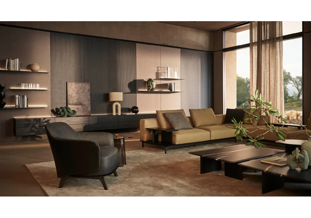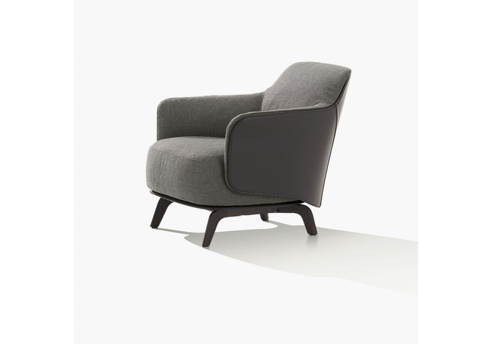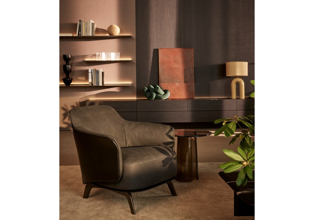 Kaori conçu par Jean-Marie Massaud pour Poliform est un fauteuil avec coque extérieure et base recouvertes de cuir, coque intérieure et assise disponible avec revêtement en tissu ou cuir. Pieds en aluminium et structure en acier verni champagne mat ou nickel brun, mat et brillant.