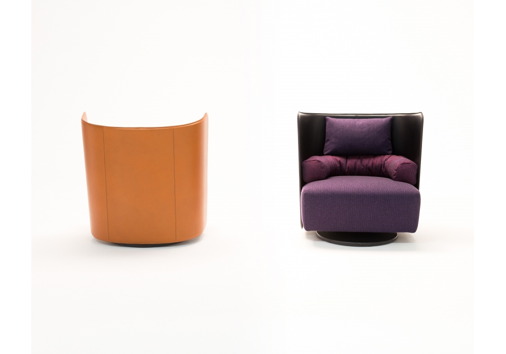 880 Campiello + conçu par De Pas, D'Urbino, Lomazzi pour Zanotta est un fauteuil avec dossier en contreplaqué recouvert de cuir, assise en polyuréthane avec citation différenciée / flocons de polyester régénéré et revêtement externe amovible en tissu. Seul le coussin lombaire peut être demandé dans une couleur différente dans le même type de tissu.