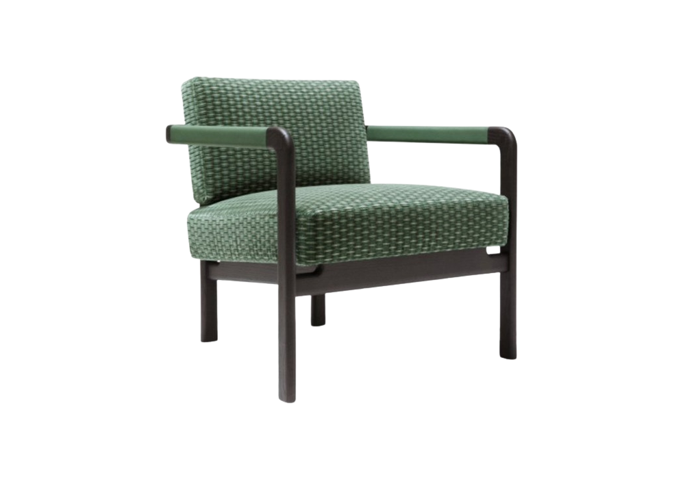 Montgomery conçu par Dainelli Studio pour Giorgetti est un fauteuil avec structure en frêne massif, en différentes finitions. Le coussin de dossier est fixé à la structure par un élastique qui s'accroche à un petit cylindre métallique visible au dos de l'assise. Les accoudoirs sont rembourrés de mousse de polyuréthane de différentes densités, avec des inserts en cuir de différentes couleurs. Le rembourrage du dossier et de l'assise, déhoussable, est mono-matière et peut être réalisé en tissu ou en cuir.