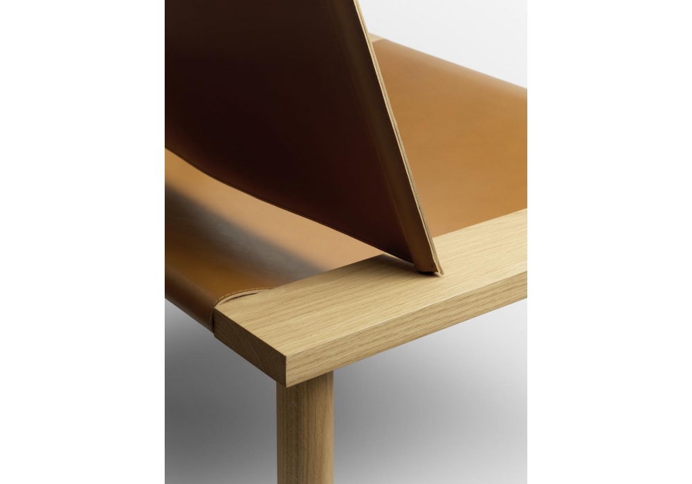 Ilma conçu par Jonas Lutz pour E15 est un fauteuil avec structure en bois, est en chêne ou noyer européen et est couplé à un harnais souple et robuste en cuir naturel, cognac ou noir.