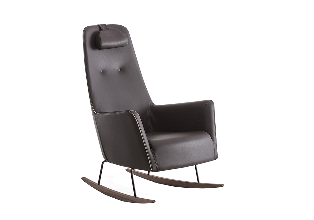 Valentina conçu par Carlo Bimbi pour Dema est un fauteuil à bascule avec structure en acier rembourrée en mousse de polyuréthane moulée et recouverte d'une doublure protectrice en tissu, ressort avec des sangles élastiques, structure de base à bascule en métal RAL 8022 avec patins en frêne. Revêtement en tissu ou cuir avec ruban contrasté.