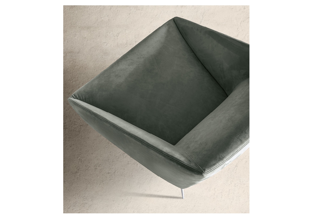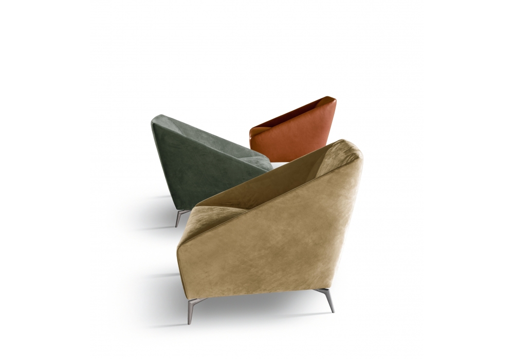 Zoe conçu par Giuseppe Bavuso pour Alivar est un fauteuil réalisé avec une structure en bois recouverte de mousse de polyuréthane de différentes densités et doublure en fibre de polyester. Pieds en fonte d'aluminium poli ou peint. Revêtement en cuir ou tissu.