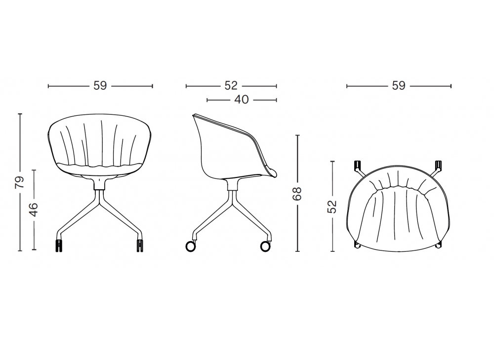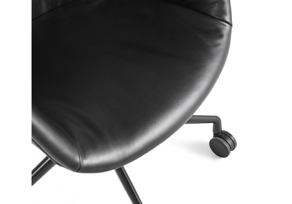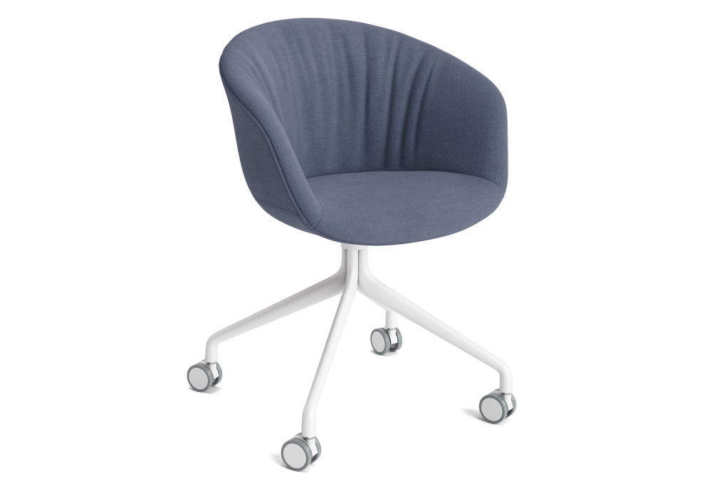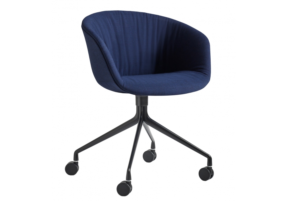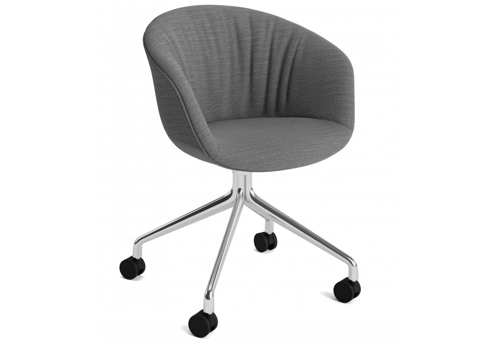About a Chair AAC 25 Soft conçu par Hee Welling & Hay pour Hay est un fauteuil pivotant avec assise en polypropylène moulé avec accoudoirs et rembourrage intégral avec partie matelassée intégrée, base pivotante à 4 rayons en fonte d'aluminium avec roulettes. Disponible en différents revêtements.
