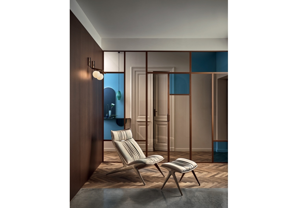 Aurora conçue par Draga & Aurel pour Opera Contemporary est une chaise longue réalisée avec structure en bois de frêne ou noyer Canaletto et métal. Rembourrage en caoutchouc et revêtement en cuir. Disponible avec ou sans ottoman.