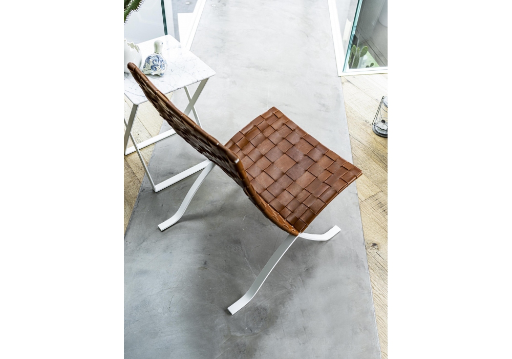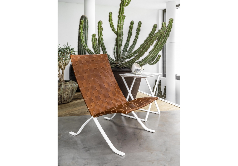 Mood Intrecciata conçu par RedCreative pour Enrico Pellizzoni est un fauteuil relax avec structure en métal peint, assise et dossier recouverts de cuir tressé. Disponible en différentes finitions.