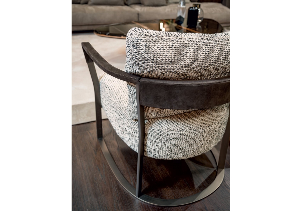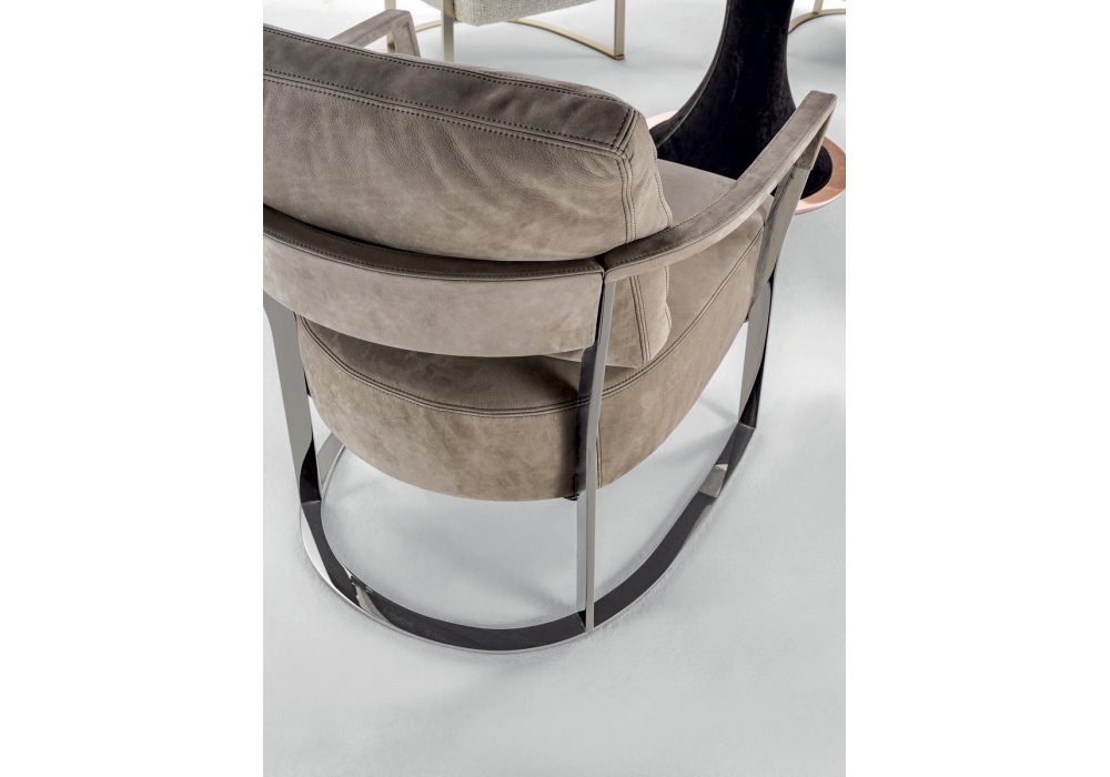 Kathryn conçu par Giuseppe Viganò pour Longhi est un fauteuil avec dossier en bois massif recouvert de cuir artisanal collé à chaud et de pièces métalliques découpées au laser avec une finition brillante ou mate. Coussin d'assise en bois et mousse de polyuréthane triple densité recouvert de cuir ou de tissu non déhoussable. Coussin de dossier en duvet d'oie stérilisé avec insert en mousse de polyuréthane à densité douce et recouvert de cuir ou de tissu déhoussable.
