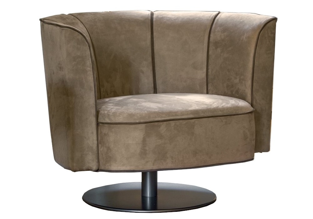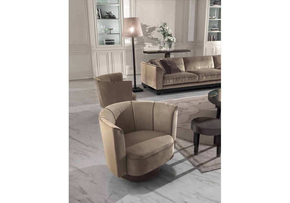 Ludwig conçu par Giuseppe Viganò pour Longhi est un fauteuil avec structure pivotante à 360° en métal mat ou brillant et structure d'assise en bois et sangles élastiques, recouvert de mousse de polyuréthane multi-densité et rembourré en tissu ou cuir inamovible. Sur demande, il est disponible en bord bicolore.