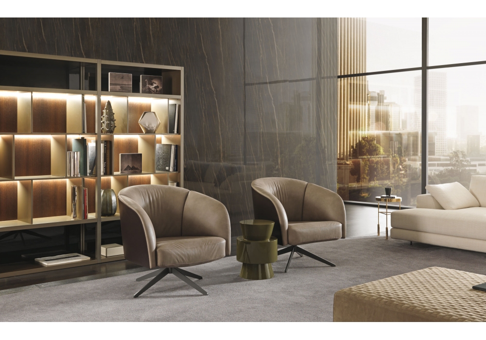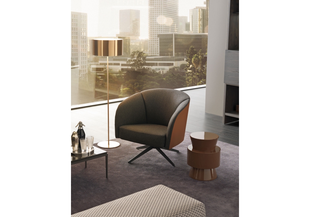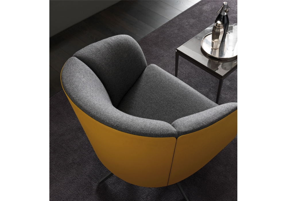 Violetta conçu par Mauro Lipparini pour MisuraEmme est un fauteuil pivotant avec coque en polyuréthane expansé à froid, base pivotante en gun metal. Revêtement en tissu, éco-cuir ou cuir, dossier du fauteuil toujours en cuir. La variante bicolore avec différentes finitions pour le rembourrage avant et arrière est disponible sur demande.