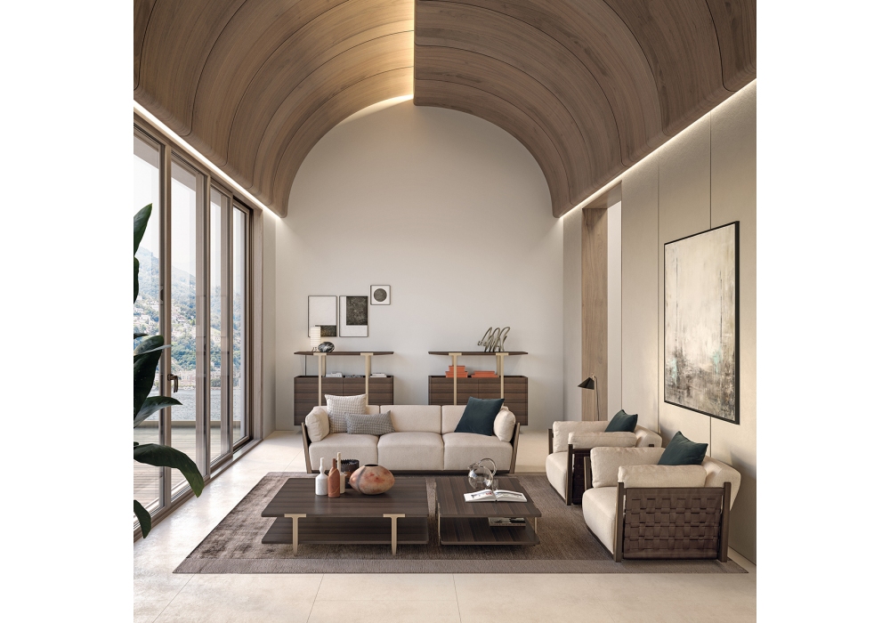 Net conçu par Matteo Nunziati pour Turri est un fauteuil avec structure en bois massif et contreplaqué recouvert de mousse de polyuréthane multi-densité. Accoudoirs et piètement en bois massif finition Eucalyptus traité thermiquement. Les panneaux latéraux sont en cuir tressé et les coussins sont recouverts de différents tissus ou cuirs. Pièces métalliques en finition platine clair mat.