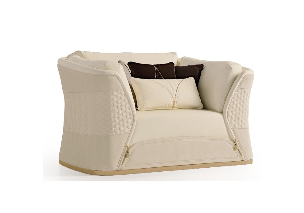 Vogue conçu par Andrea Bonini pour Turri est un fauteuil avec structure en bois massif et contreplaqué recouvert de mousse de polyuréthane multi-densité. Coque en cuir brodé hexagone et coussins en différents cuirs ou tissus. Base et détails décoratifs en métal doré.