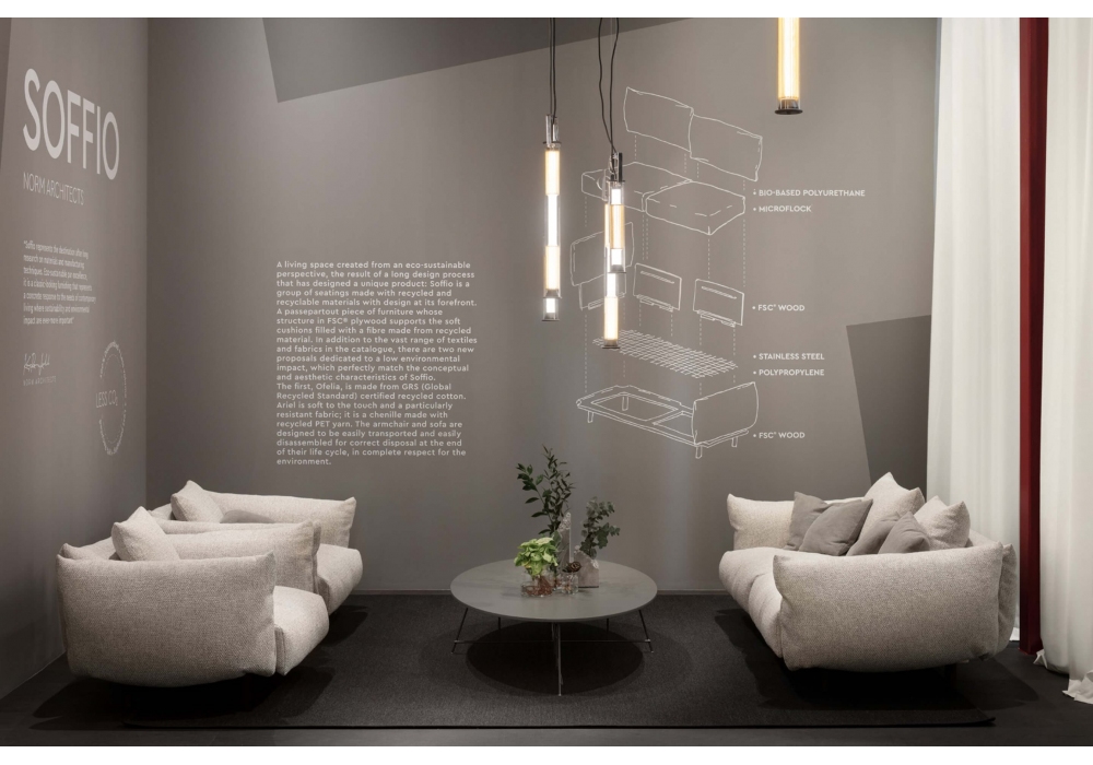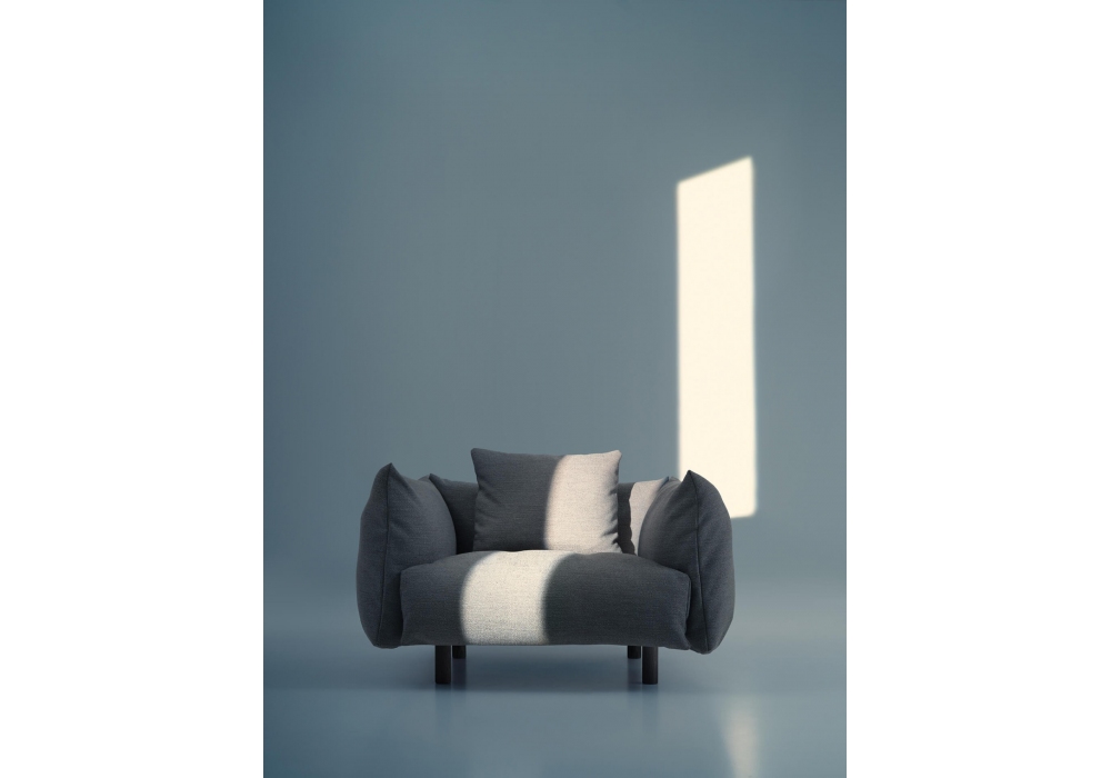 Soffio conçu par Norm Architects pour Lema est un fauteuil avec une structure en contreplaqué FSC® qui supporte les coussins moelleux rembourrés avec une fibre de matériau recyclé. Disponible en différentes finitions et en deux tailles.