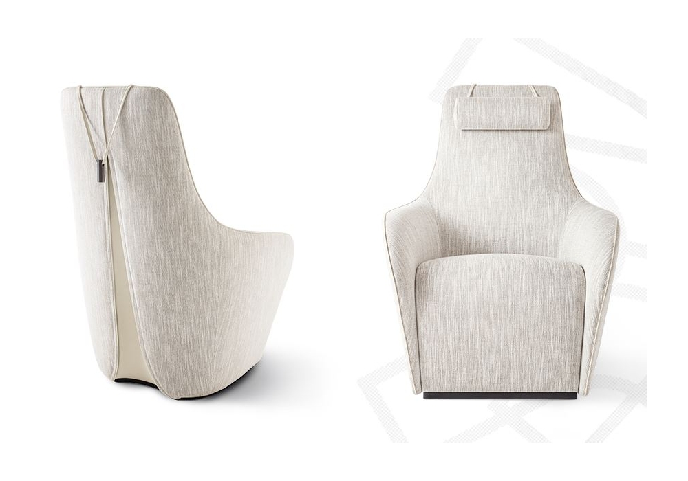 Tie XL conçu par M2Atelier pour Giorgetti est un fauteuil avec structure en Polimex (matériau composite polyester/polyuréthane) et rembourrage en mousse de polyuréthane recouverte de fibre. Le revêtement est disponible en tissu ou en cuir dans différentes finitions. Appui-tête ovale, piètement en frêne gris anthracite et passepoil toujours assorti à la couleur du cuir de l'insert.