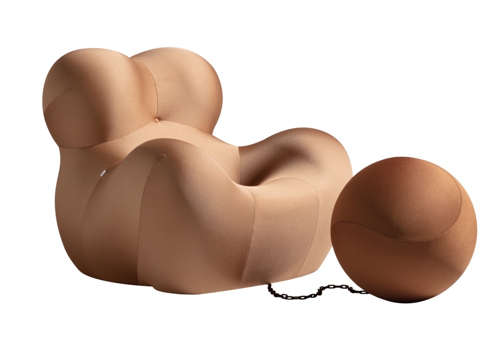 Serie Up Compasso d'Oro conçu par Gaetano Pesce pour B&B Italia est un fauteuil recouvert du tissu exclusif CD de couleur or antique, tandis que le pouf sphérique est en tissu de couleur bronze. Chaîne en aluminium anodisé finition corten.