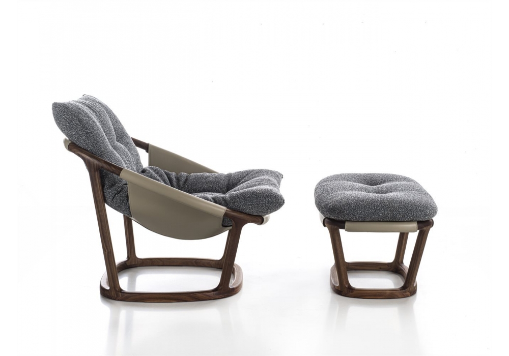 Amarantha conçu par Emmanuel Gallina pour Porada est un fauteuil réalisé avec structure en noyer canaletta massif et coque en cuir Cuoietto. Coussin en fibre de polyester et inserts en polyuréthane déhoussable. Disponible avec ou sans pouf.