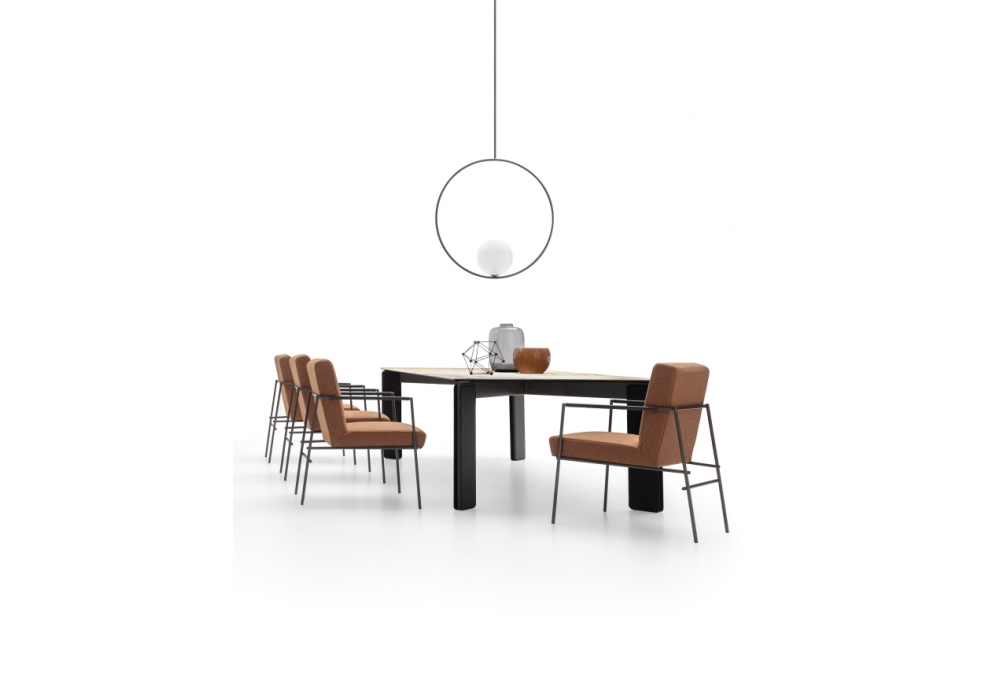 Kyo conçu par Stefano Spessotto pour Ditre Italia est un fauteuil avec structure en métal peint, assise et dossier rembourrés avec revêtement en tissu ou cuir. Également disponible dans la version mix, coussins en tissu avec côtés et dossier en cuir.