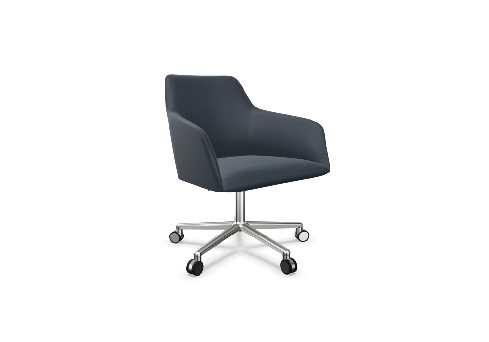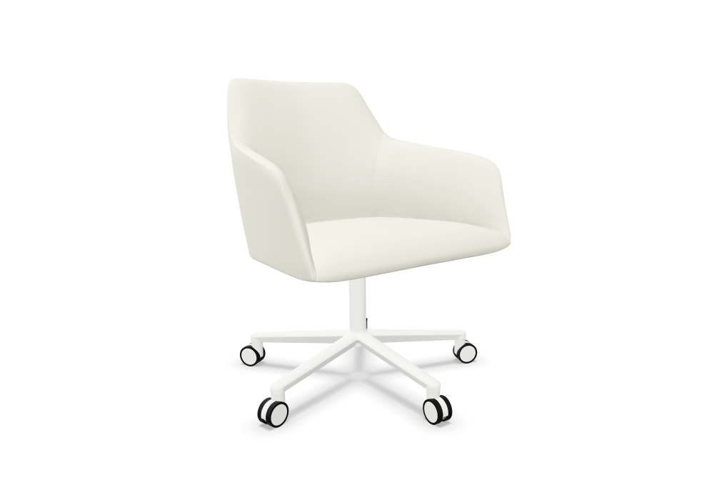Alya conçu par Lievore Altherr Molina pour Andreu World est un fauteuil pivotant avec assise et dossier rembourrés et base centrale en aluminium à 5 roues avec réglage pneumatique de la hauteur. Disponible en aluminium poli, blanc ou noir. Revêtement en différents tissus, cuir ou simili cuir.