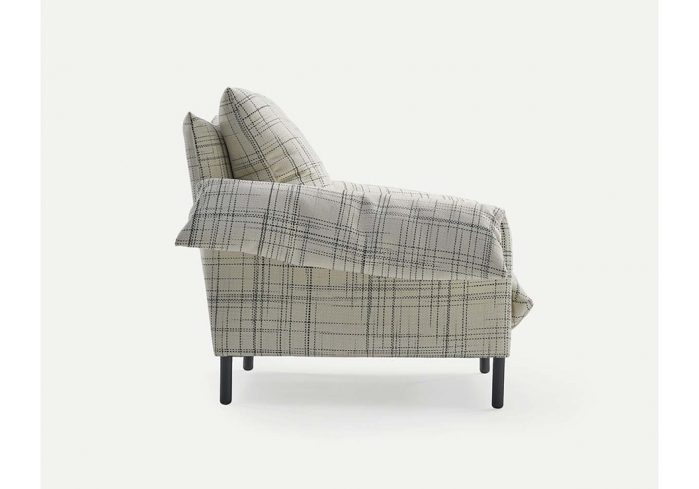 Alpino conçu par Rafa García est un fauteuil en bois et acier, assise et dossier rembourrés avec revêtement en tissu ou cuir, pieds en chêne. Disponible en différentes finitions.