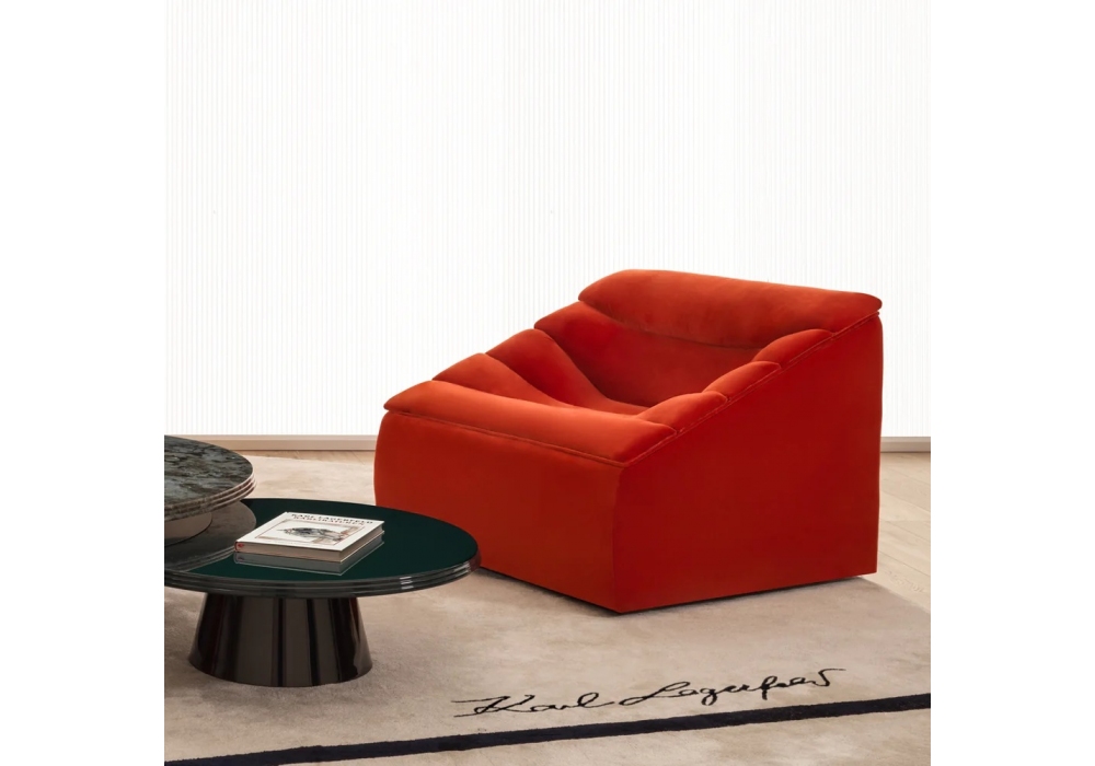 Wellen, conçu par Toan Nguyen pour Karl Lagerfeld Maison, est un fauteuil pivotant avec structure interne en bois et revêtement non déhoussable disponible dans différents tissus.