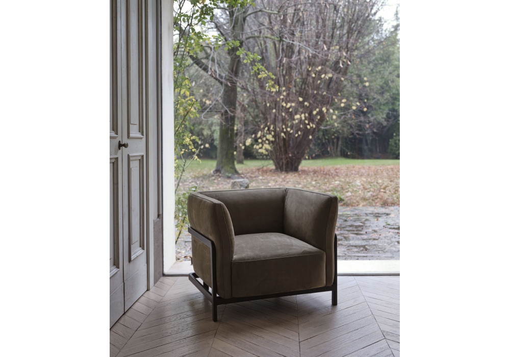 Dominick conçu par Enrico Cesana pour Conte Casa est un fauteuil réalisé avec une structure en bois massif, un rembourrage en mousse de polyuréthane et un revêtement en tissu ou en cuir.