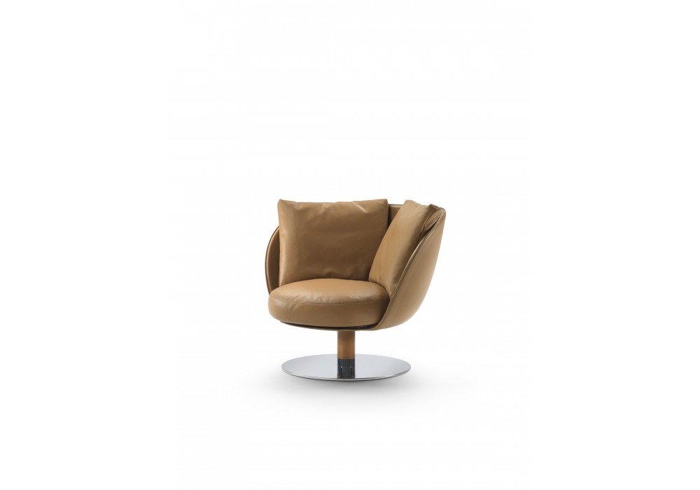 Conçu par Fumie Shibata pour Flexform, Eri est un fauteuil pivotant en polyuréthane rigide couplé à du polyuréthane expansé, revêtu de cuir ou de tissu. Piètement en métal. Disponible en différentes finitions.